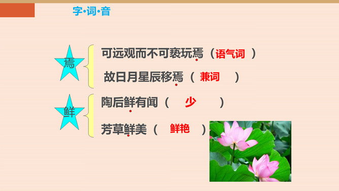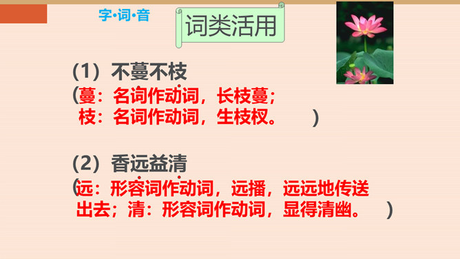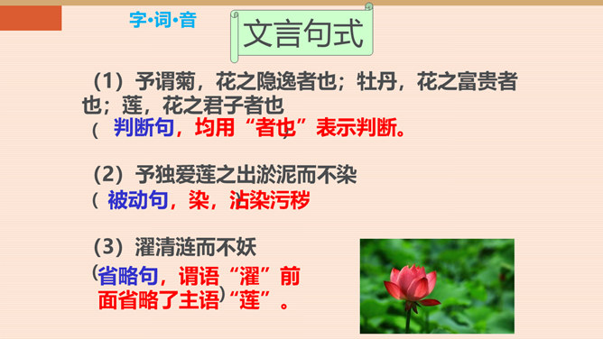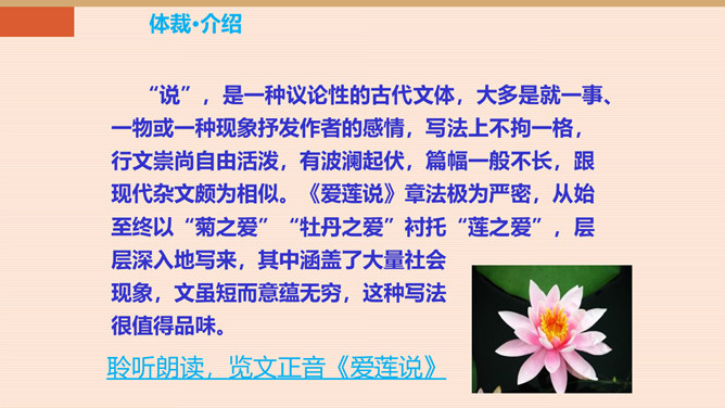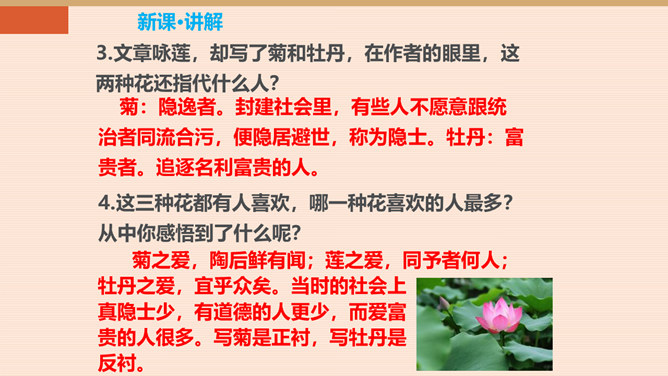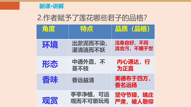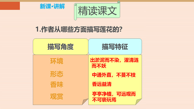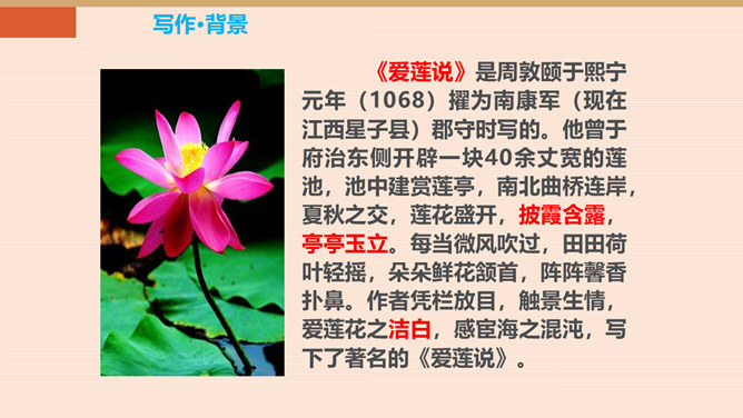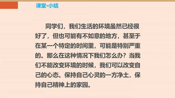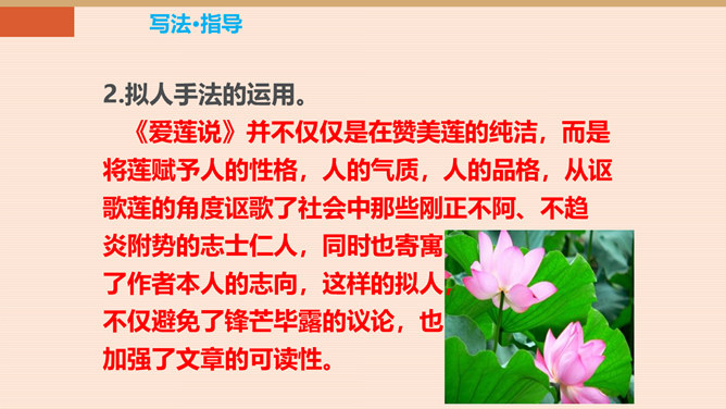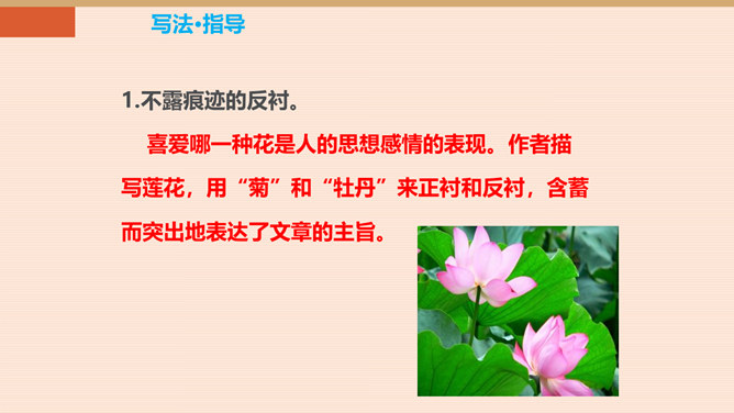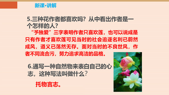 1.不露痕迹的反衬。喜爱哪一种花是人的思想感情的表现。作者描写莲花,用“菊”和“牡丹”来正衬和反衬,含蓄而突出地表达了文章的主旨。2.拟人手法的运用。并不仅仅是在赞美莲的纯洁,而是将莲赋予人的性格,人的气质,人的品格,从讴歌莲的角度讴歌了社会中那些刚正不阿、不趋炎附势的志士仁人,同时也寄寓了作者本人的志向,这样的拟人,不仅避免了锋芒毕露的议论,也加强了文章的可读性。同学们,我们生活的环境虽然已经很好了,但也可能有不如意的地方,甚至于在某一个特定的时间里,可能是特别严重的。那么在这种情况下我们怎么办?所属专题:爱莲说ppt。