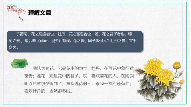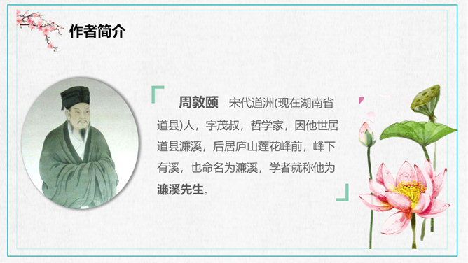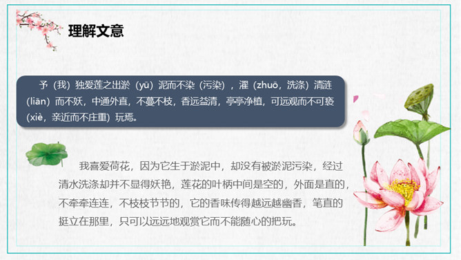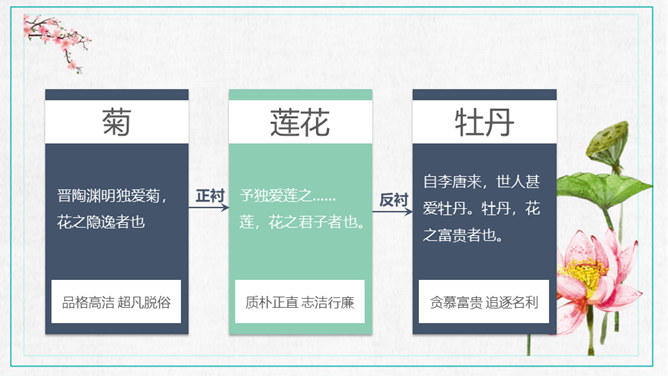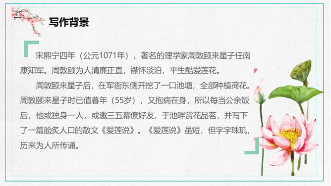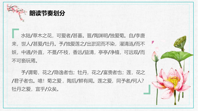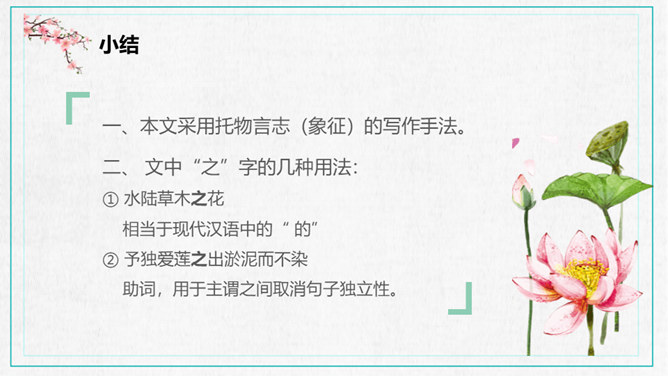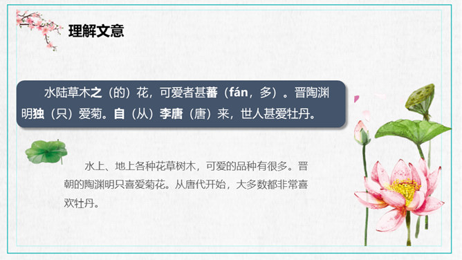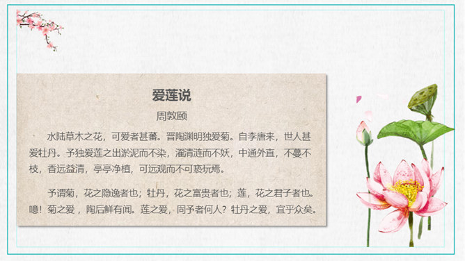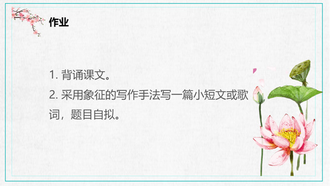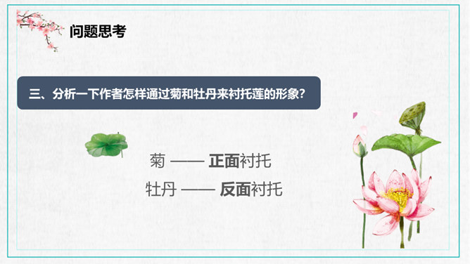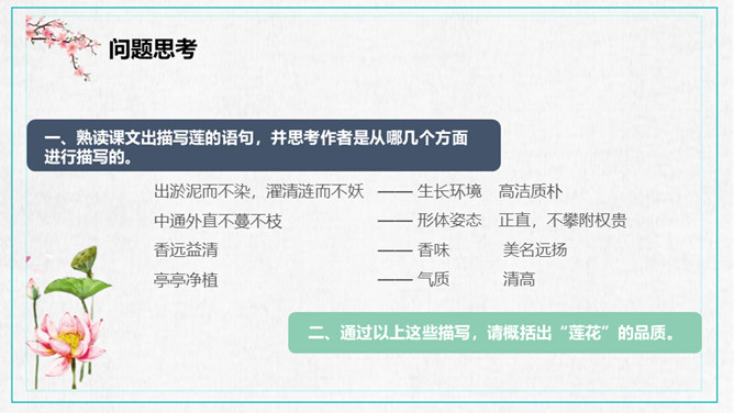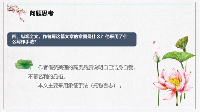 一、熟读课文出描写莲的语句,并思考作者是从哪几个方面进行描写的。二、通过以上这些描写,请概括出“莲花”的品质。三、分析一下作者怎样通过菊和牡丹来衬托莲的形象?四、纵观全文,作者写这篇文章的意图是什么?他采用了什么写作手法? 作者借赞美莲的高贵品质说明自己洁身自爱,不慕名利的品格。本文主要采用象征手法(托物言志) 。1. 背诵课文。2. 采用象征的写作手法写一篇小短文或歌词,题目自拟。所属专题:爱莲说ppt。