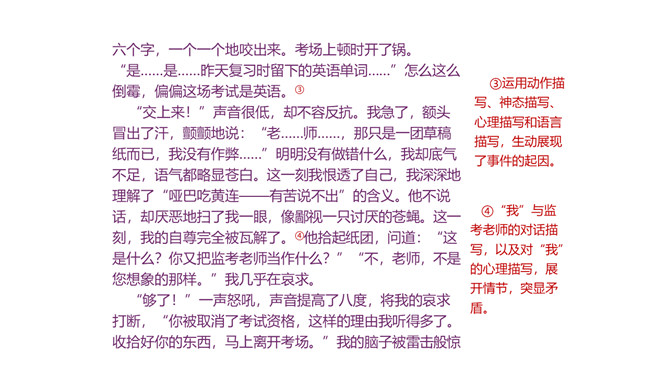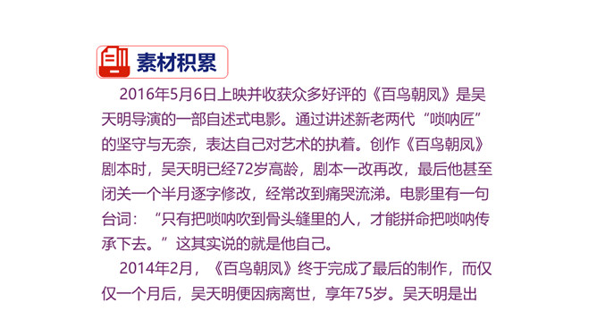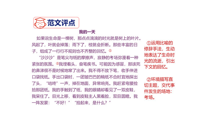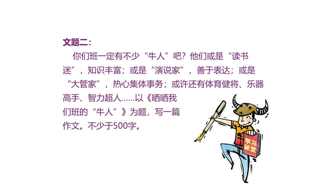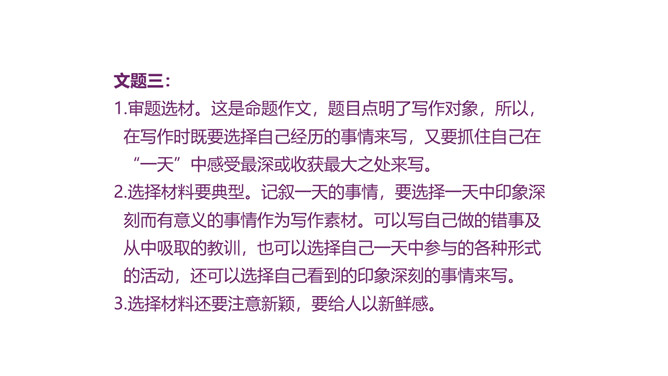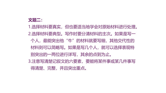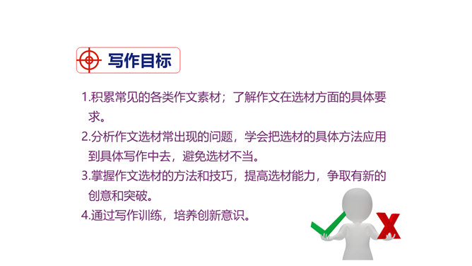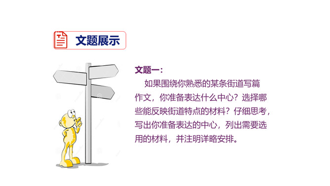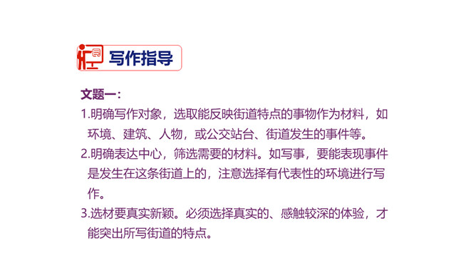 1.积累常见的各类作文素材;了解作文在选材方面的具体要求。2.分析作文选材常出现的问题,学会把选材的具体方法应用到具体写作中去,避免选材不当。3.掌握作文选材的方法和技巧,提高选材能力,争取有新的创意和突破。4.通过写作训练,培养创新意识。文题一:如果围绕你熟悉的某条街道写篇作文,你准备表达什么中心?选择哪些能反映街道特点的材料?仔细思考,写出你准备表达的中心,列出需要选用的材料,并注明详略安排。所属专题:怎样选材ppt。