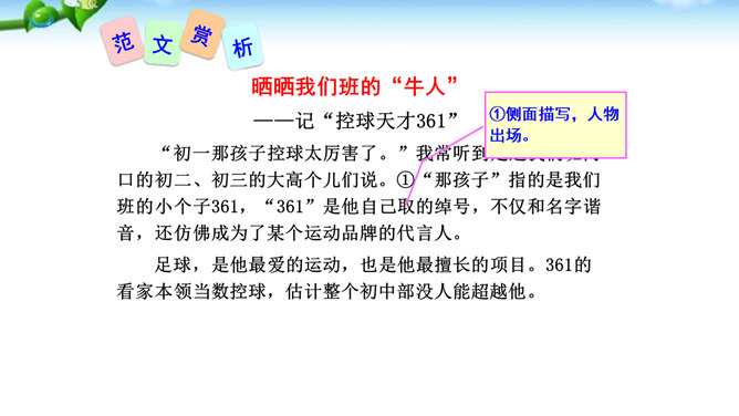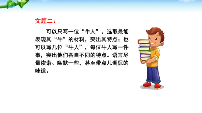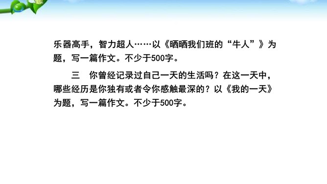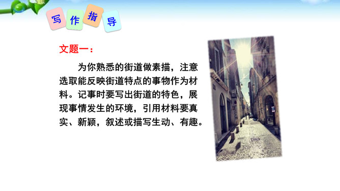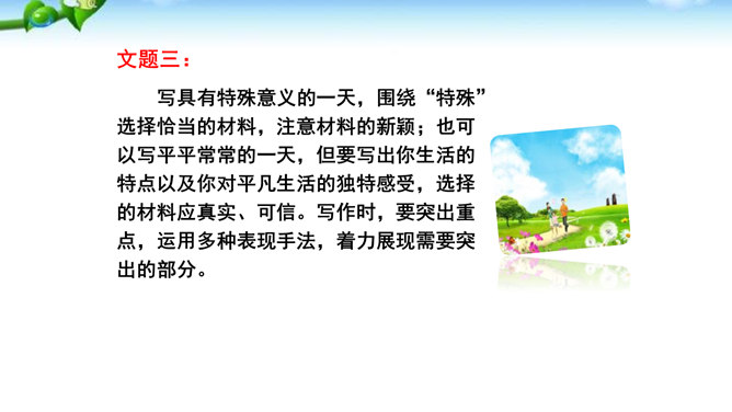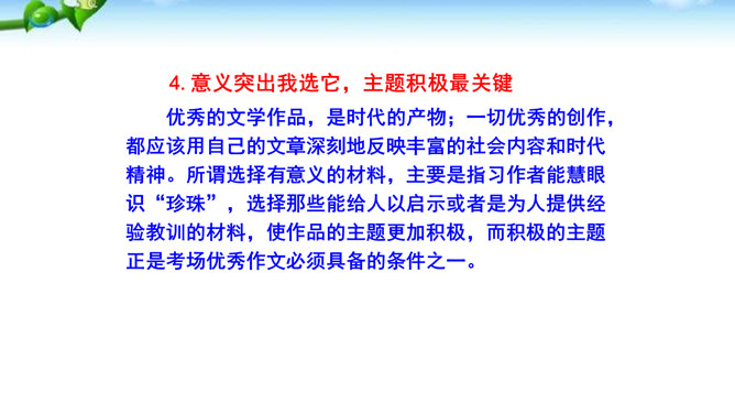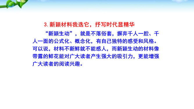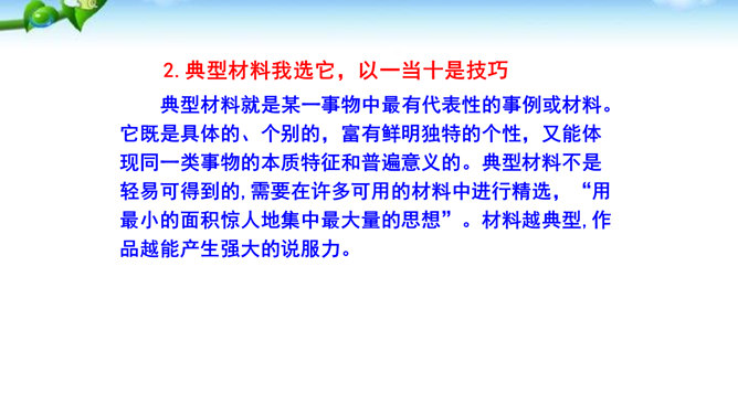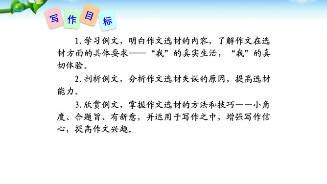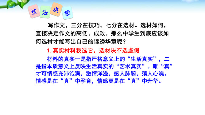 写作文,三分在技巧,七分在选材。选材如何,直接决定作文的高低、成败。那么中学生到底应该如何选材才能写出自己的锦绣华章呢?真实材料我选它,选材决不选虚假。材料的真实一是指严格意义上的“生活真实”,二是指本质意义上反映生活真实的“艺术真实”。唯“真”才可情感充沛饱满,激情洋溢,感人肺腑,荡人心魄。情感是在“真”中孕育,情感更是在“真”中升华。典型材料我选它,以一当十是技巧。典型材料就是某一事物中最有代表性的事例或材料。它既是具体的、个别的,富有鲜明独特的个性,又能体现同一类事物的本质特征和普遍意义的。所属专题:怎样选材ppt。