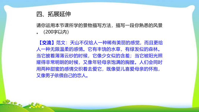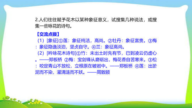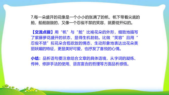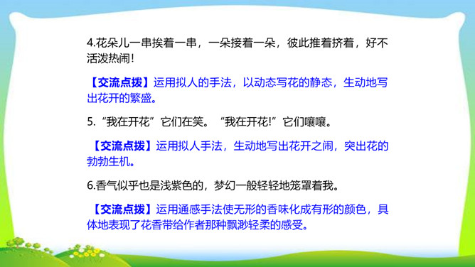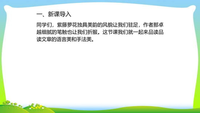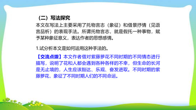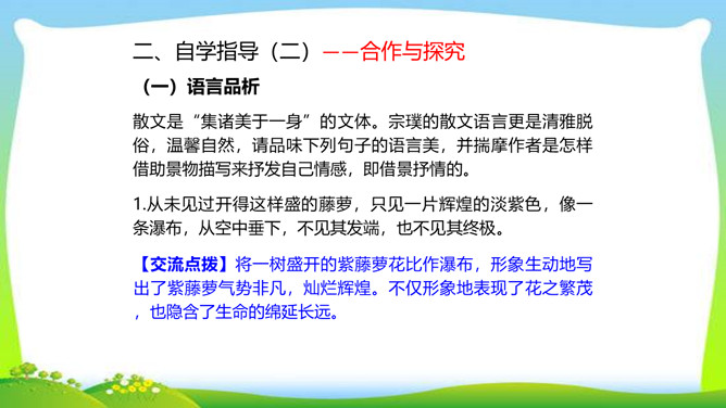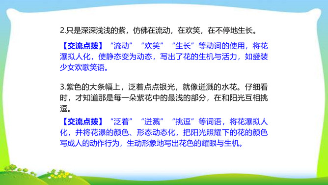同学们,紫藤萝花独具美韵的风貌让我们驻足,作者那卓越细腻的笔触也让我们折服。这节课我们就一起来品读品读文章的语言美和手法美。将一树盛开的紫藤萝花比作瀑布,形象生动地写出了紫藤萝气势非凡,灿烂辉煌。不仅形象地表现了花之繁茂,也隐含了生命的绵延长远。“流动”“欢笑”“生长”等动词的使用,将花瀑拟人化,使静态变为动态,写出了花的生机与活力,如盛装少女欢歌笑语。“泛着”“迸溅”“挑逗”等词语,将花瀑拟人化,并将花瀑的颜色、形态动态化,把阳光照耀下的花的颜色写成人的动作行为,生动形象地写出花色的耀眼与生机。所属专题:紫藤萝瀑布ppt。