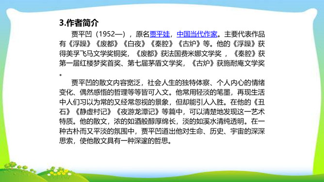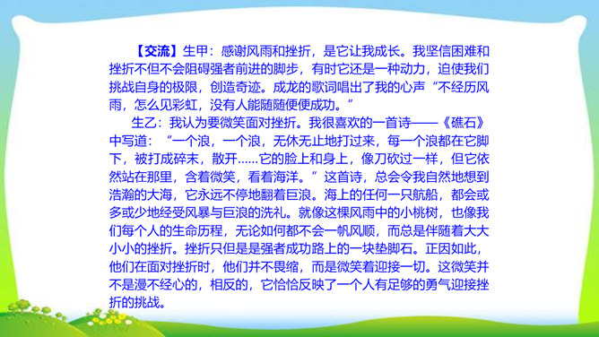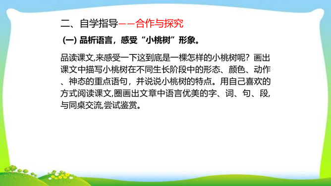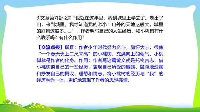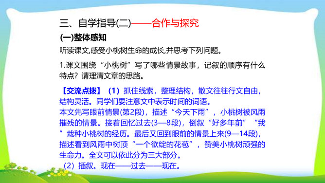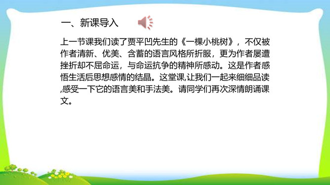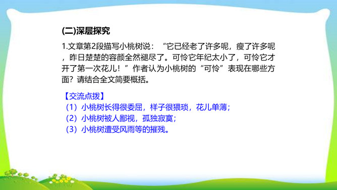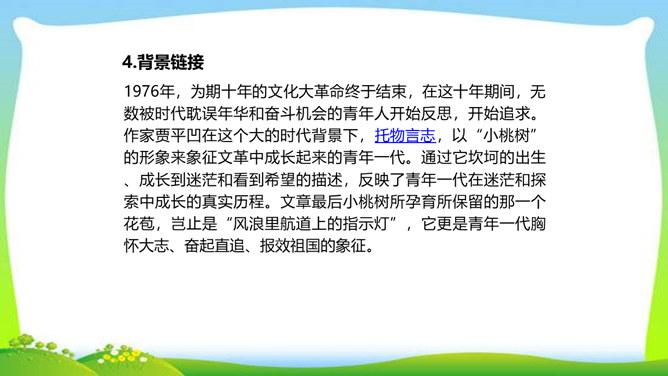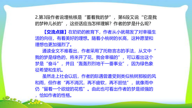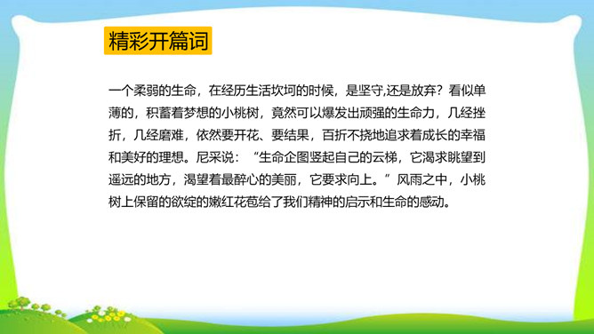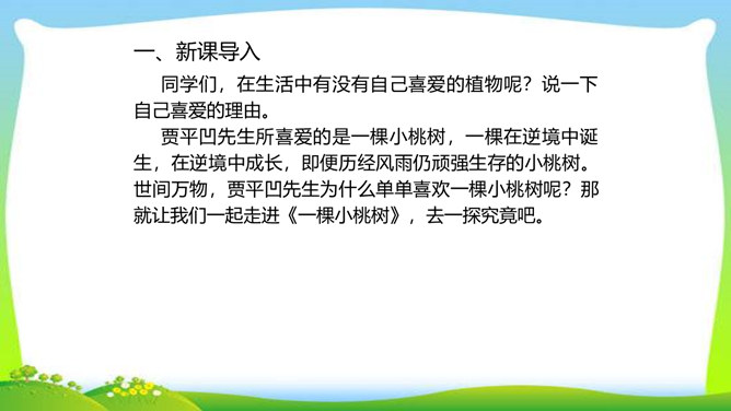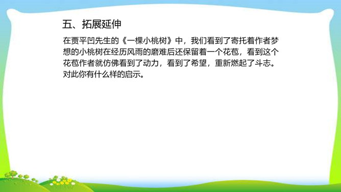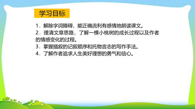 一个柔弱的生命,在经历生活坎坷的时候,是坚守,还是放弃?看似单薄的,积蓄着梦想的小桃树,竟然可以爆发出顽强的生命力,几经挫折,几经磨难,依然要开花、要结果,百折不挠地追求着成长的幸福和美好的理想。尼采说:“生命企图竖起自己的云梯,它渴求眺望到遥远的地方,渴望着最醉心的美丽,它要求向上。”风雨之中,小桃树上保留的欲绽的嫩红花苞给了我们精神的启示和生命的感动。解除字词障碍,能正确流利有感情地朗读课文。理清文章思路,了解一棵小桃树的成长过程以及作者的情感变化的过程。所属专题:一颗小桃树ppt。