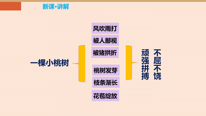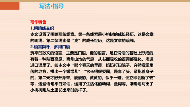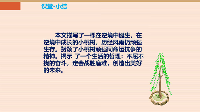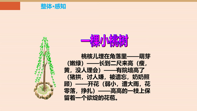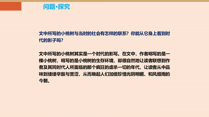 文中所写的小桃树与当时的社会有怎样的联系?你能从它身上看到时代的影子吗?文中所写的小桃树其实是一个时代的影写。在文中,作者明写的是一棵小桃树,明写的是小桃树的生存环境,却很自然地让读者联想到作者及其同时代人所面临的那个疯狂的虐杀一切的年代,让读者从中品味到缕缕辛酸与苦涩,从而唤起人们加倍珍惜光阴明媚、和风细雨的今朝。本文设置了明暗两条线索。第一条线索是小桃树的成长经历,这是文章的明线。第二条线索是“我”的成长经历,这是文章的暗线。所属专题:一颗小桃树ppt。
