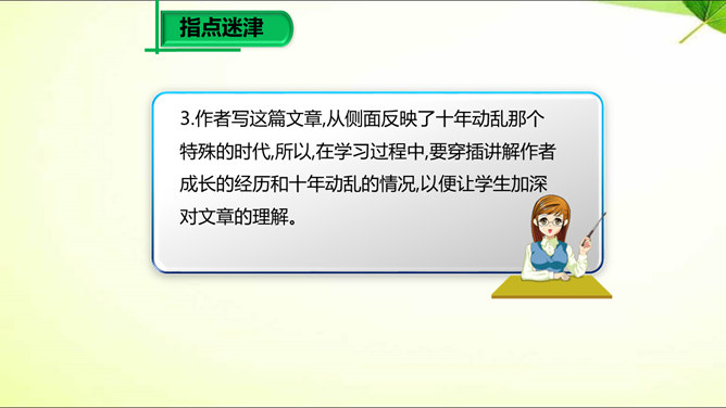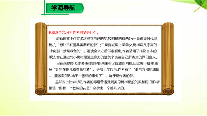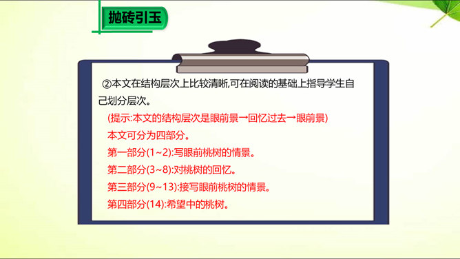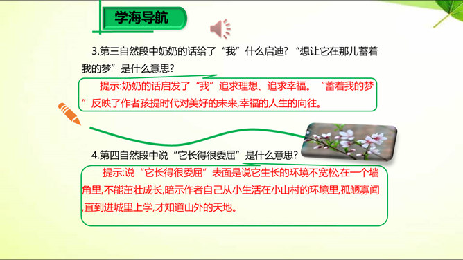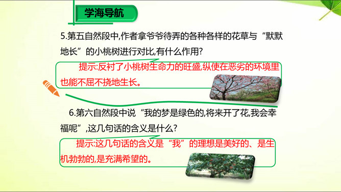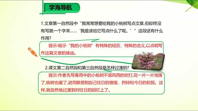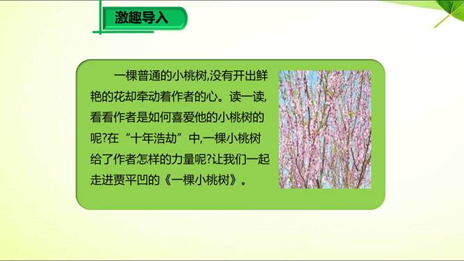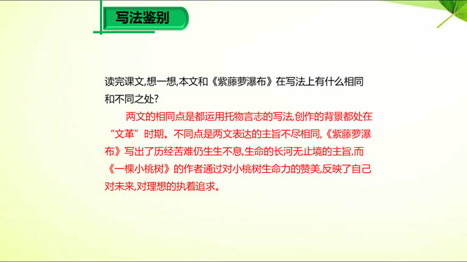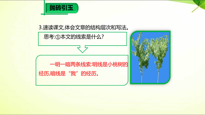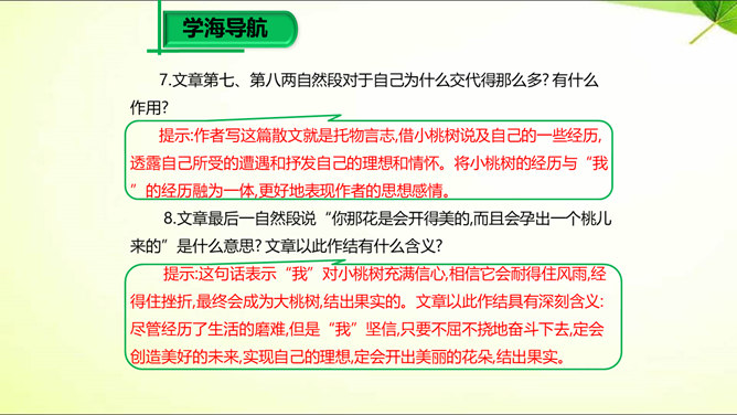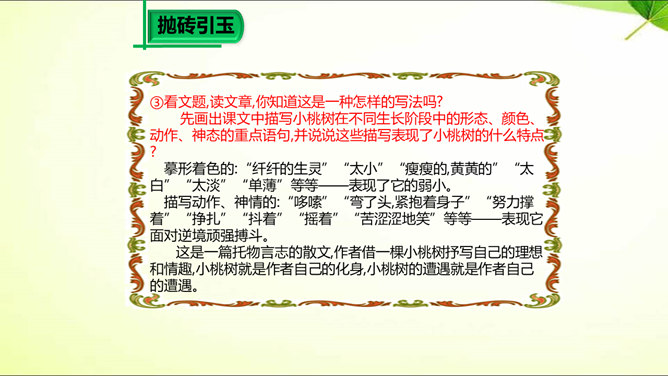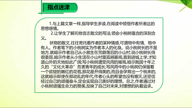 作者笔下的小桃树实为作者本人的化身。说小桃树长的不是地方,就暗示作者自己从小就生在荒僻落后的小山村;说小桃树长得很委屈,暗示作者从小生活在小山村里孤陋寡闻,直到进城上学,才知道山外的天地如此广阔;写小桃树遭受风雨的摧残,暗示我国十年之久的“文化大革命”危害青年的成长;写风雨中的小桃树仍保留着一个欲绽的嫩红的花苞,那花是开得美的,而且会孕育出一个桃来的,这就暗示即使在那动乱的年代,作者心头的希望也没有熄灭,还坚信经过自己的顽强奋斗,定会实现自己美好的理想。作者通过对小桃树顽强生命力的赞美,反映了自己对未来,对理想的执着追求。所属专题:一颗小桃树ppt。