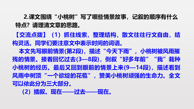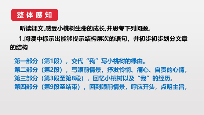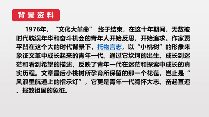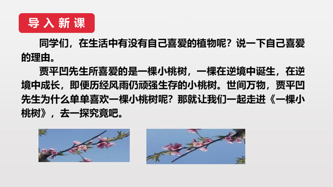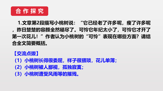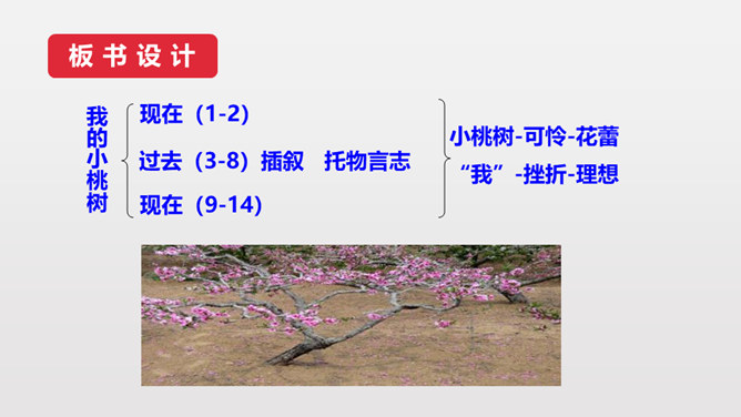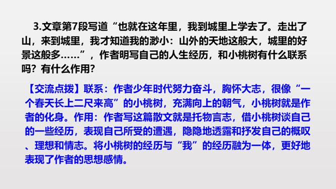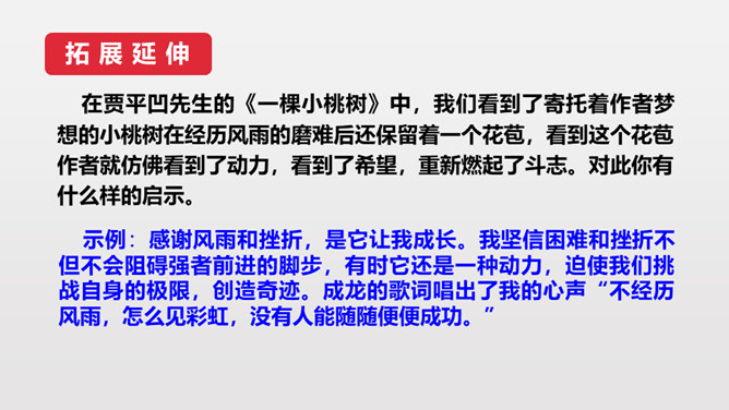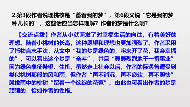 第3段作者说埋桃核是“蓄着我的梦”,第6段又说“它是我的梦种儿长的”,这些话应当怎样理解?作者的梦是什么呢?作者从小就萌发了对幸福生活的向往,有着美好的理想。随着小桃树的长高,这种愿望和理想也更加强烈了。作者采用了托物言志手法,从文中“我的梦是绿色的,将来开了花,我会幸福的”,可以看出这个梦是“奋斗”,并且“轰轰烈烈地干一番事业”因为绿色象征希望、生机。虽然走上社会以后,作者的际遇曾遭受到类似桃树那般的风和雨,但作者“再不消沉,再不疲软,再不胆怯”就像雨中的桃树“留着一个欲绽的花苞”。所属专题:一颗小桃树ppt。