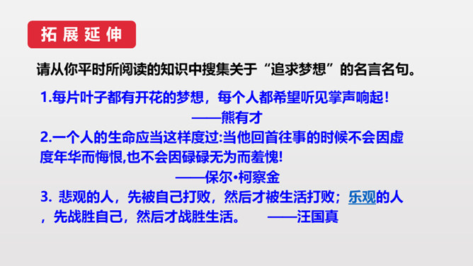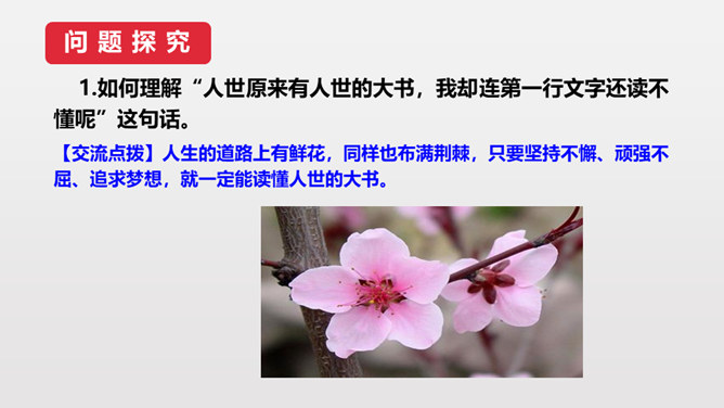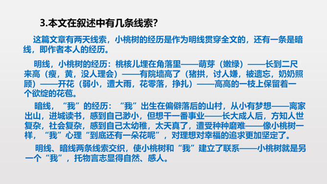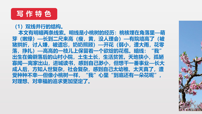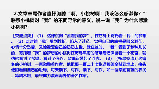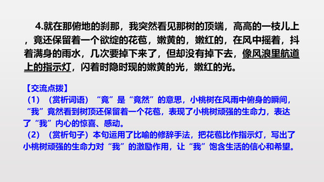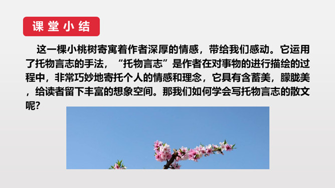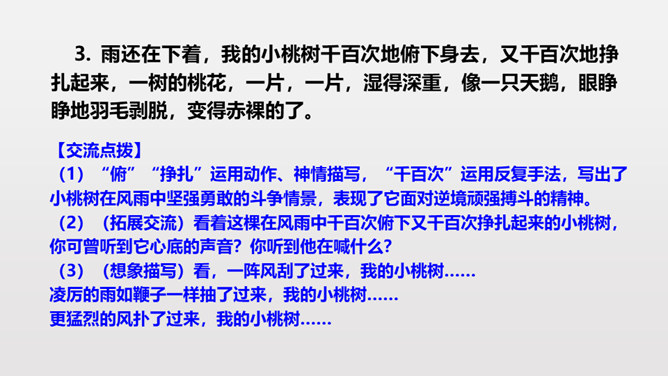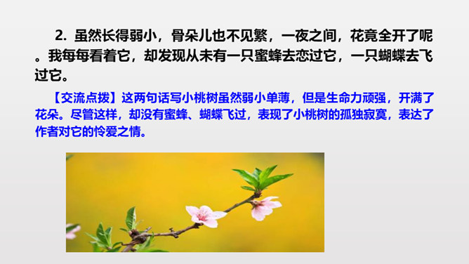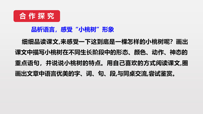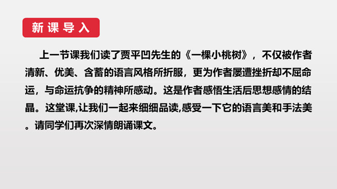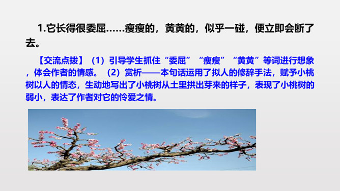 上一节课我们读了贾平凹先生的课文,不仅被作者清新、优美、含蓄的语言风格所折服,更为作者屡遭挫折却不屈命运,与命运抗争的精神所感动。这是作者感悟生活后思想感情的结晶。这堂课,让我们一起来细细品读,感受一下它的语言美和手法美。请同学们再次深情朗诵课文。细细品读课文,来感受一下这到底是一棵怎样的小桃树呢?画出课文中描写小桃树在不同生长阶段中的形态、颜色、动作、神态的重点语句,并说说小桃树的特点。用自己喜欢的方式阅读课文,圈画出文章中语言优美的字、词、句、段,与同桌交流,尝试鉴赏。所属专题:一颗小桃树ppt。