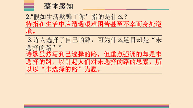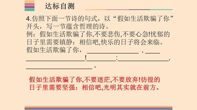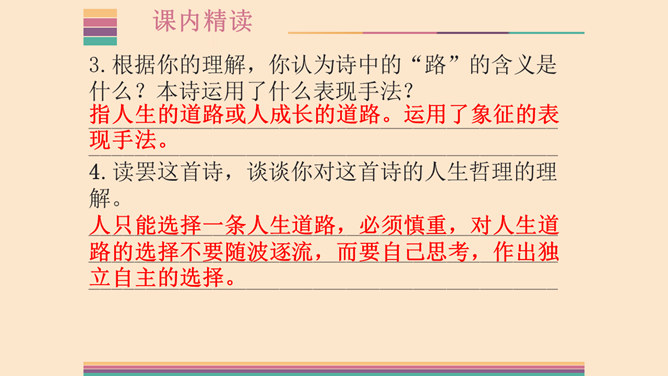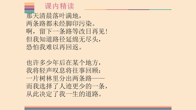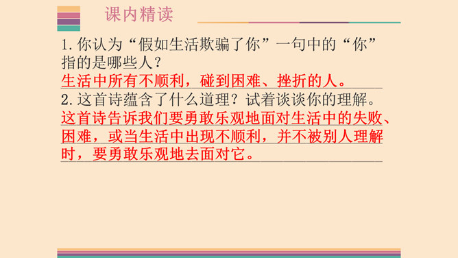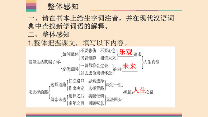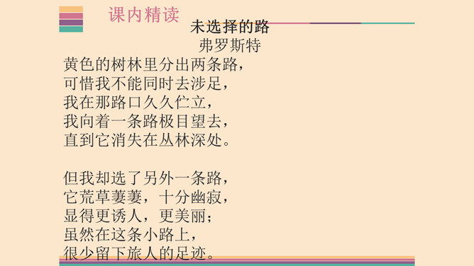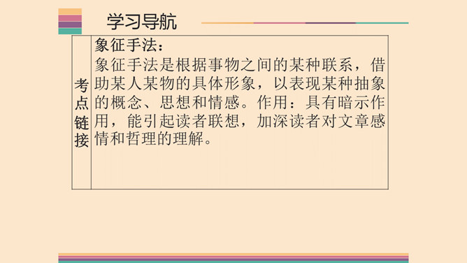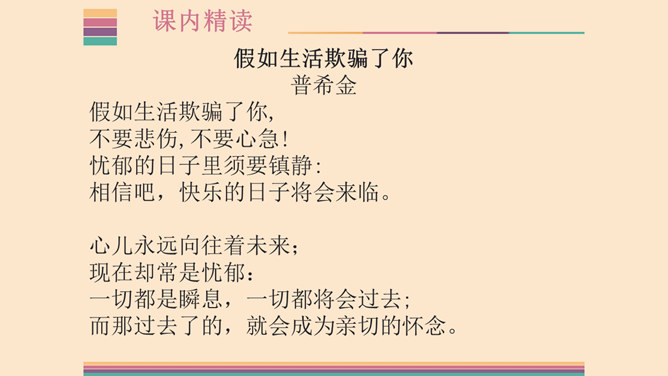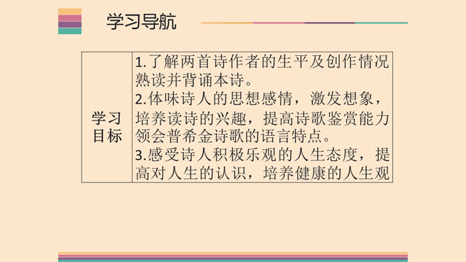 1.了解两首诗作者的生平及创作情况,熟读并背诵本诗。2.体味诗人的思想感情,激发想象,培养读诗的兴趣,提高诗歌鉴赏能力;领会普希金诗歌的语言特点。3.感受诗人积极乐观的人生态度,提高对人生的认识,培养健康的人生观。象征手法:象征手法是根据事物之间的某种联系,借助某人某物的具体形象,以表现某种抽象的概念、思想和情感。作用:具有暗示作用,能引起读者联想,加深读者对文章感情和哲理的理解。所属专题:假如生活欺骗了你ppt、未选择的路ppt。
