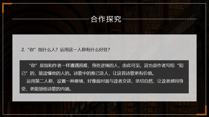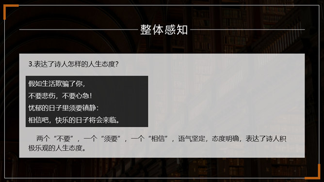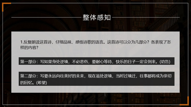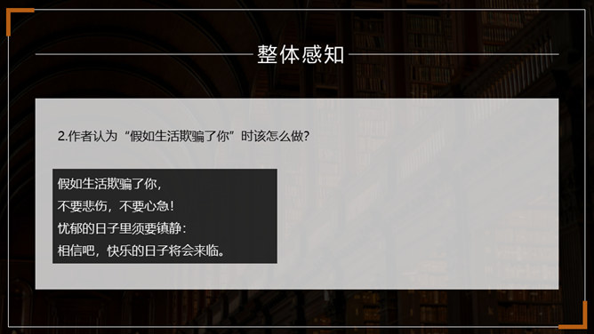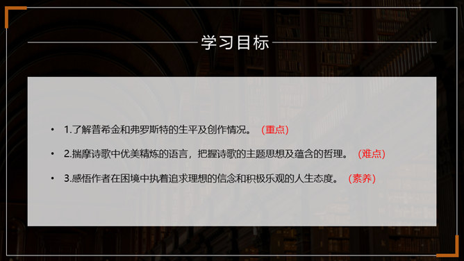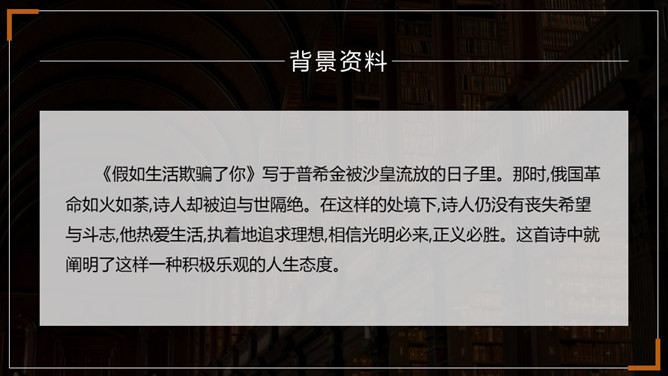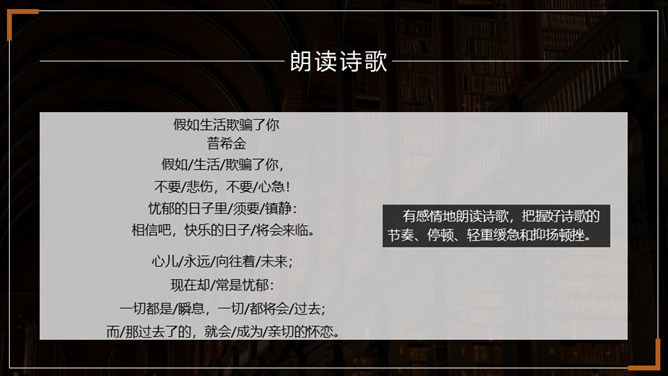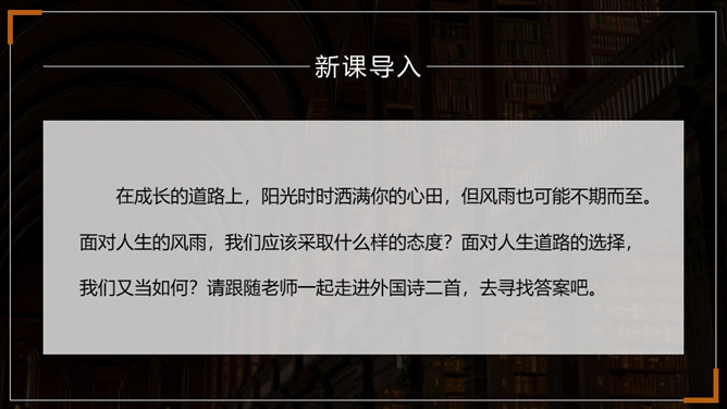 在成长的道路上,阳光时时洒满你的心田,但风雨也可能不期而至。面对人生的风雨,我们应该采取什么样的态度?面对人生道路的选择,我们又当如何?请跟随老师一起走进外国诗二首,去寻找答案吧。1.了解普希金和弗罗斯特的生平及创作情况。(重点)2.揣摩诗歌中优美精炼的语言,把握诗歌的主题思想及蕴含的哲理。(难点)3.感悟作者在困境中执着追求理想的信念和积极乐观的人生态度。(素养)所属专题:假如生活欺骗了你ppt、未选择的路ppt。