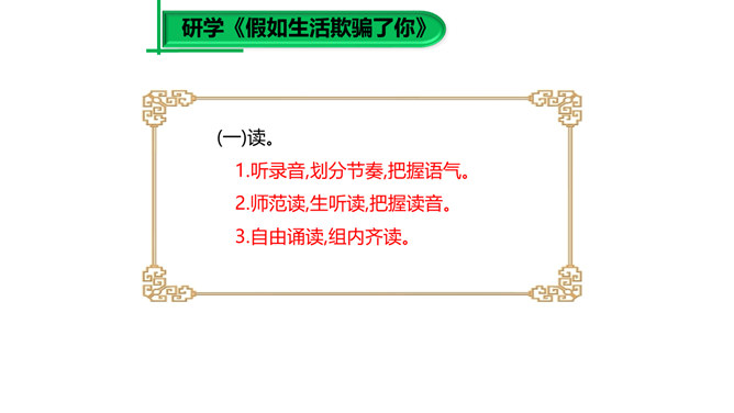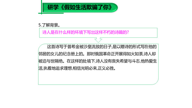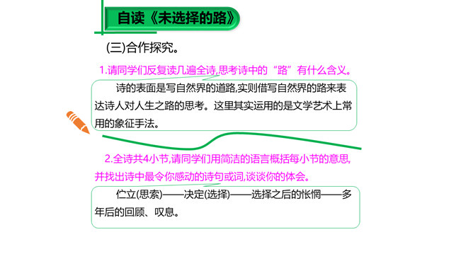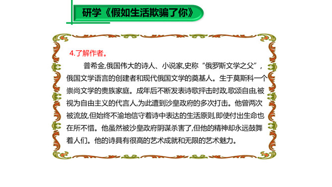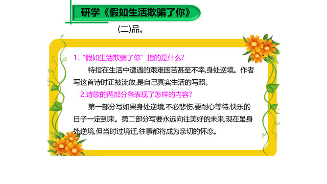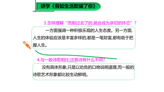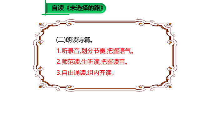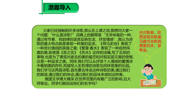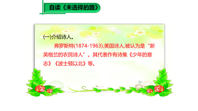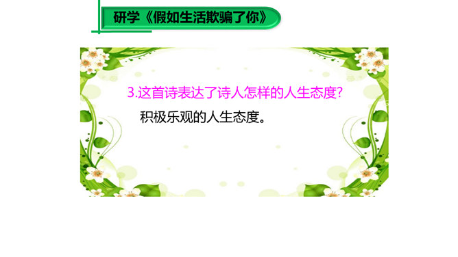 大家已经接触到许多诗歌,那么在上课之前,我想问大家一个问题:“什么是诗歌?”词典上的解释是“文学体裁的一种,通过有节奏、有韵律的语言反映生活、抒发情感”,我认为诗歌的最大特点就是表现一种美的追求。《荷马史诗》表现了一种悲壮雄阔的英雄之美;《繁星·春水》表现了一种自然纯真的美,即使是《恶之花》《死水》这样的诗篇,写了丑恶的事物,也是为了表现对逝去的美的留恋和对现实毁灭美的愤慨,这是一种追求之美。同样,我们可以从抒发个人情感的爱情诗中看到美的存在,而描写人生哲理的诗歌也同样是美的乐园。所属专题:假如生活欺骗了你ppt、未选择的路ppt。