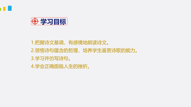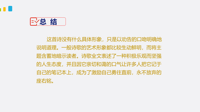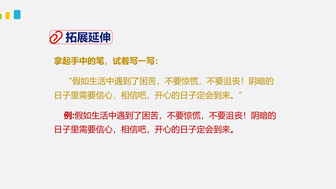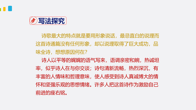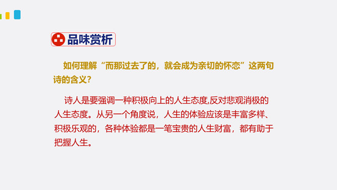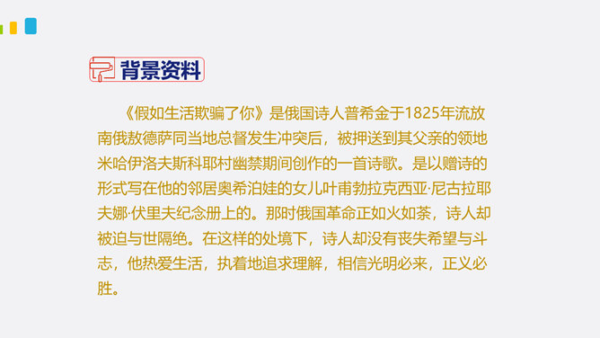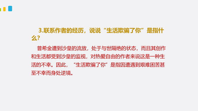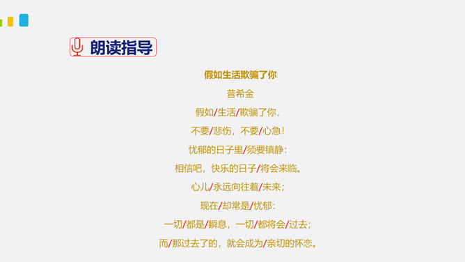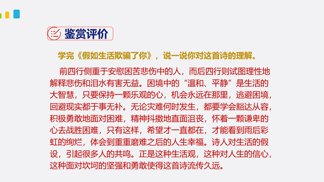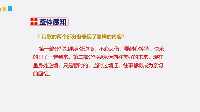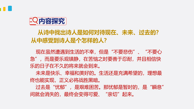 诗歌的两个部分各表现了怎样的内容?第一部分写如果身处逆境,不必悲伤,要耐心等待,快乐的日子一定到来。第二部分写要永远向往美好的未来,现在虽身处逆境,只是暂时的,当时过境迁,往事都将成为亲切的回忆。诗人在诗中阐明了怎样的人生态度?积极乐观的人生态度:当生活欺骗了你时,不要悲伤,不要心急,在苦恼的时候要善于忍耐,一切都会过去,我们一定要永葆积极乐观的心态,生活中不可能没有痛苦与悲伤,欢乐不会永远被忧伤所掩盖,快乐的日子终会到来。从诗中找出诗人是如何对待现在、未来、过去的?