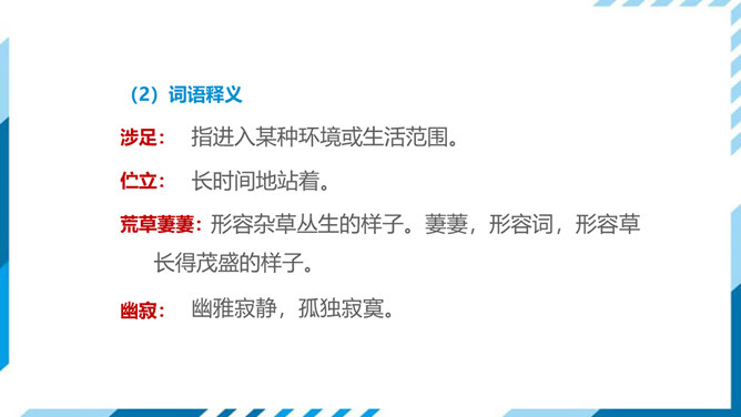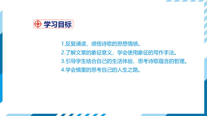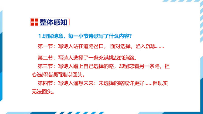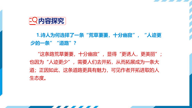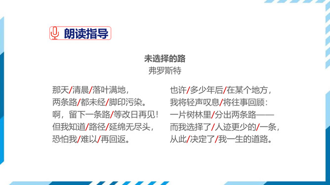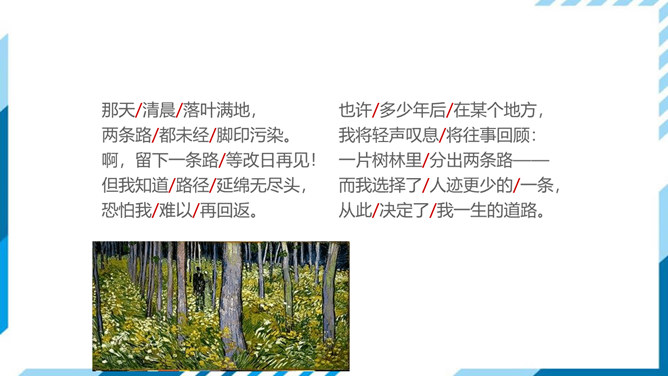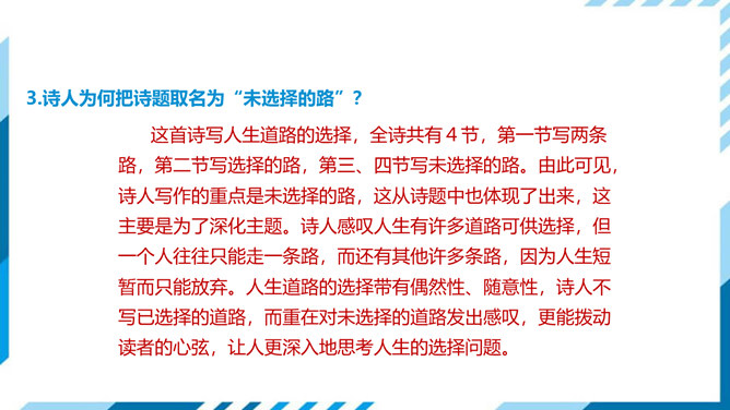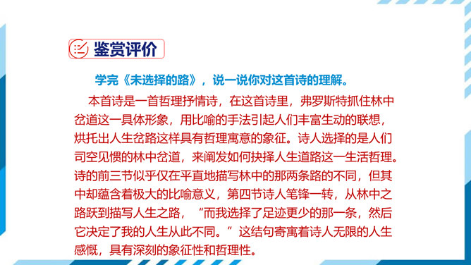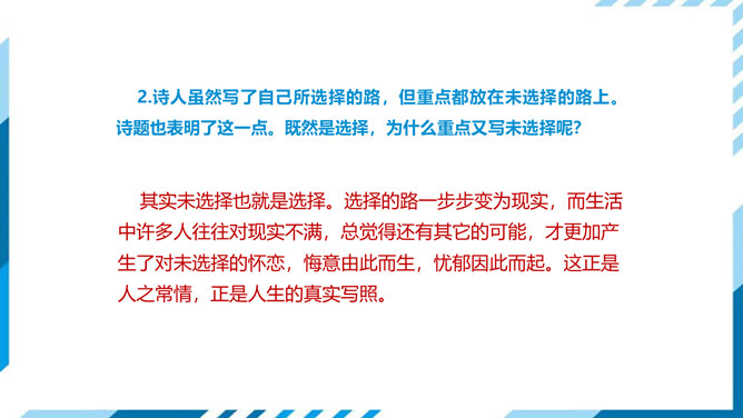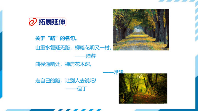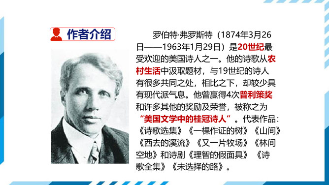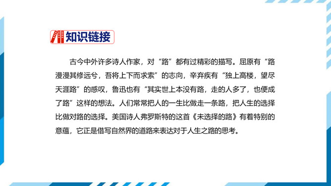 古今中外许多诗人作家,对“路”都有过精彩的描写。屈原有“路漫漫其修远兮,吾将上下而求索”的志向,辛弃疾有“独上高楼,望尽天涯路”的感叹,鲁迅也有“其实世上本没有路,走的人多了,也便成了路”这样的想法。人们常常把人的一生比做走一条路,把人生的选择比做对路的选择。美国诗人弗罗斯特的这首诗有着特别的意蕴,它正是借写自然界的道路来表达对于人生之路的思考。 “路”,表面指自然界中的道路,另一层的意思暗指人生之路。诗的表面是写自然界的道路,实则借写自然界的路来表达诗人对人生之路的思考。所属专题:未选择的路ppt。