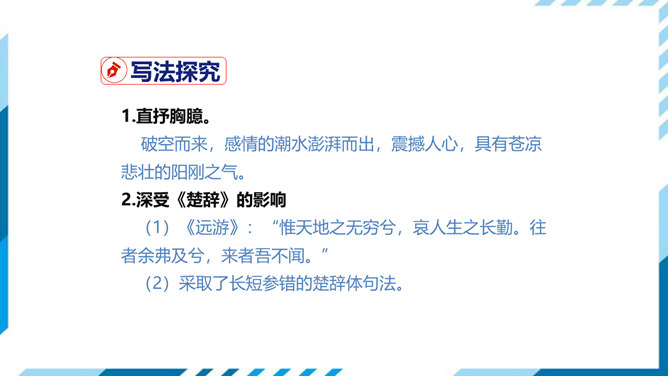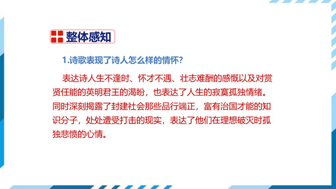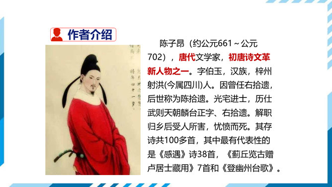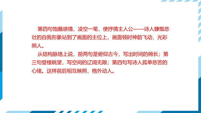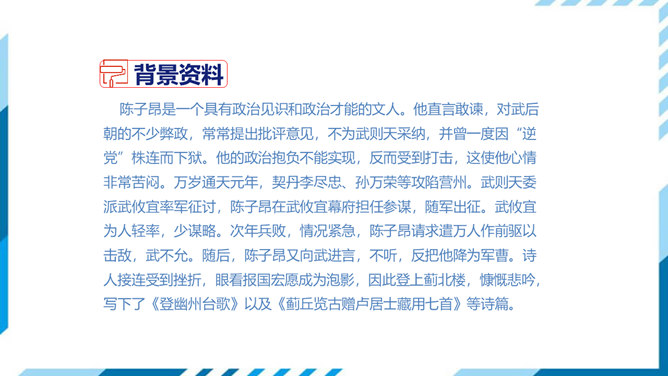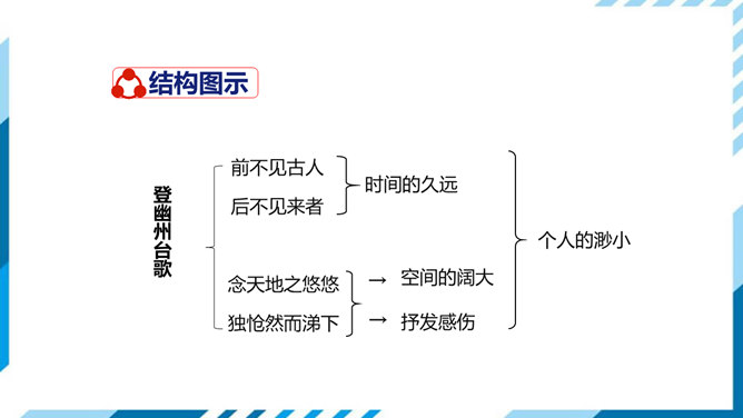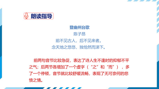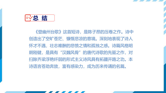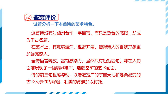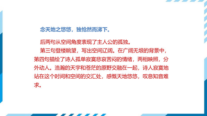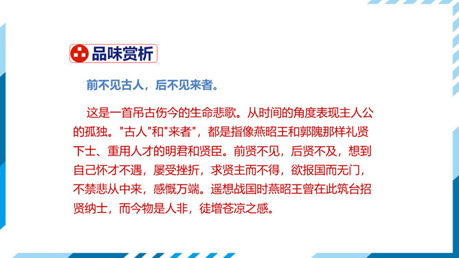这是一首吊古伤今的生命悲歌。从时间的角度表现主人公的孤独。"古人"和"来者",都是指像燕昭王和郭隗那样礼贤下士、重用人才的明君和贤臣。前贤不见,后贤不及,想到自己怀才不遇,屡受挫折,求贤主而不得,欲报国而无门,不禁悲从中来,感慨万端。遥想战国时燕昭王曾在此筑台招贤纳士,而今物是人非,徒增苍凉之感。两句从空间角度表现了主人公的孤独。第三句登楼眺望,写出空间辽阔。在广阔无垠的背景中,第四句描绘了诗人孤单寂寞悲哀苦闷的情绪,两相映照,分外动人。所属专题:登幽州台歌ppt。