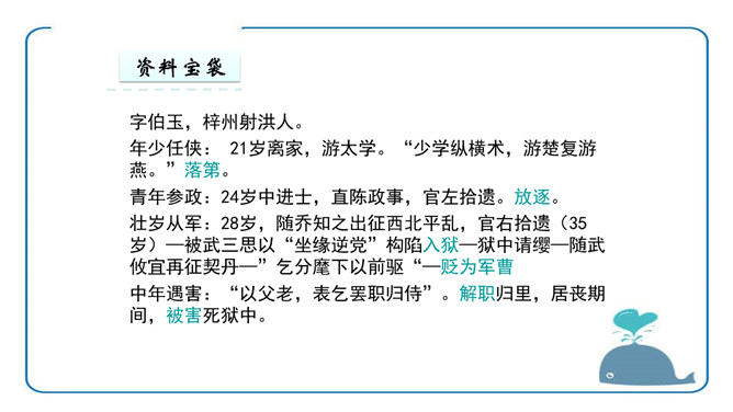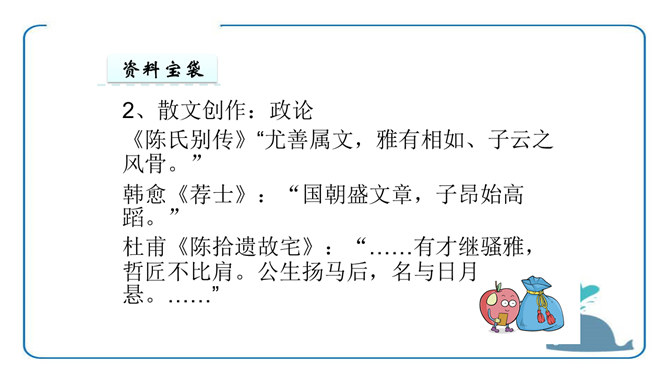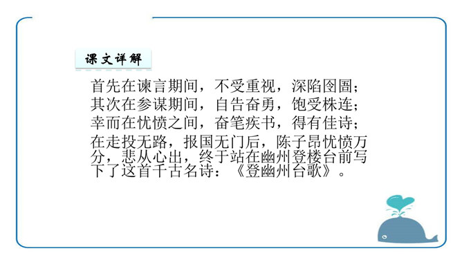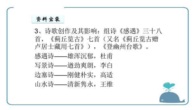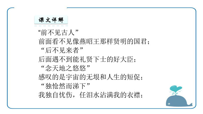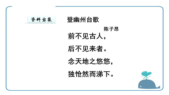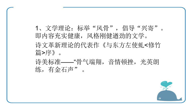 文学理论:标举“风骨”,倡导“兴寄”。即内容充实健康,风格刚健遒劲的文学。诗文革新理论的代表作《与东方左使虬<修竹篇>序》。诗美标准——“骨气端翔,音情顿挫,光英朗练,有金石声” 。超越个人牢骚的具体性,成为一般人生活的象征,可以忽略诗人的情感背景,成为共通情感的符号。“将个人、一己、暂时的受意投放到广阔天地和悠远时空,将前人、今人、来者的共通感受一网打尽。”苍天无语,只能静静地听他倾诉,北风呼啸,替他把满腔悲愤宣泄,情何以堪,让我们把把诗人的情感宣泄出来吧,有没有谁能像老师这样抒发一下感情的?所属专题:登幽州台歌ppt。
