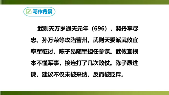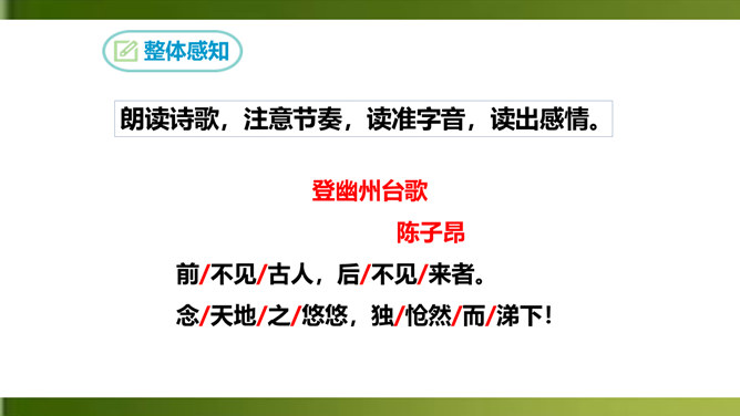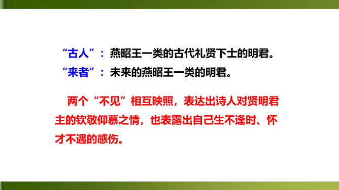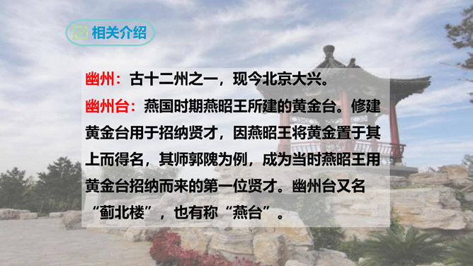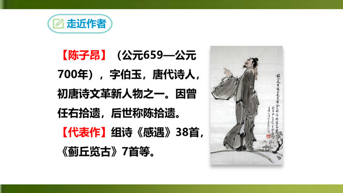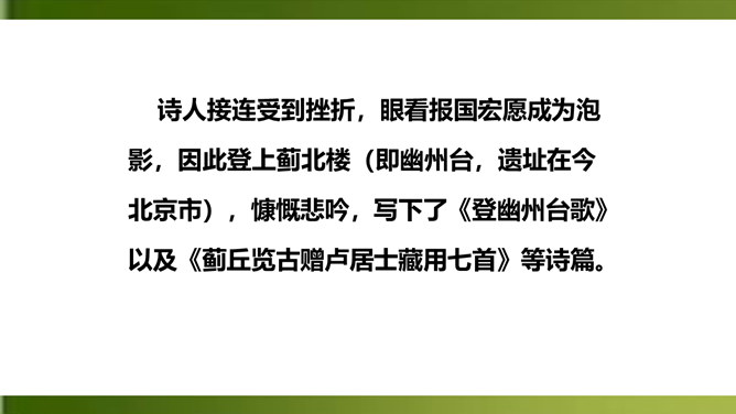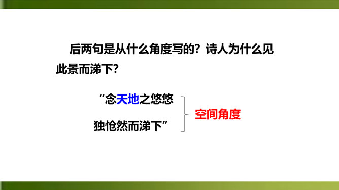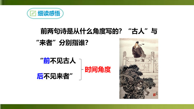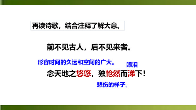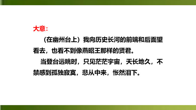 俯仰天地,天高地远,寰宇苍茫,反衬出诗人无比的渺小和孤单。诗人不禁怆然涕下。这种一己的悲哀里,蕴含着伟大的孤独感,透露出英雄无用武之地、抚剑四顾茫茫而慷慨悲歌的豪侠气概。语言苍劲奔放,富有感染力。这首诗虽然只有短短四句,却在人们面前展现了一幅境界雄浑、浩瀚空旷的艺术画面。诗的前三句粗笔勾勒,以浩渺宽广的宇宙天地和沧桑易变的古今人事作为深邃、壮美的背景加以衬托。第四句饱蘸感情,凌空一笔,使抒情主人公——诗人慷慨悲壮的自我形象站到了画面的主位上,画面顿时神韵飞动,光彩照人。所属专题:登幽州台歌ppt。