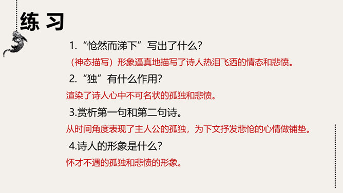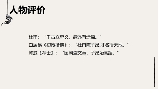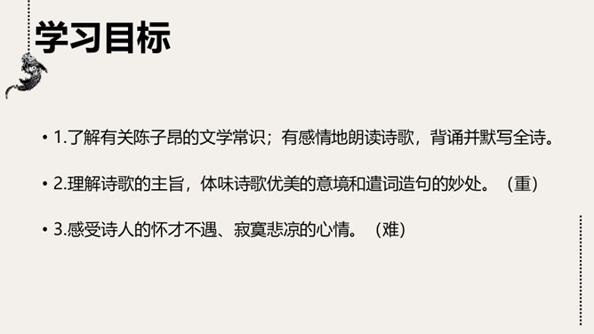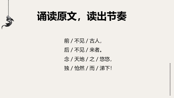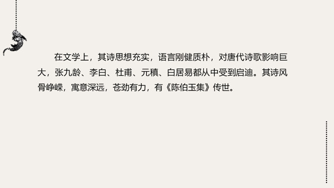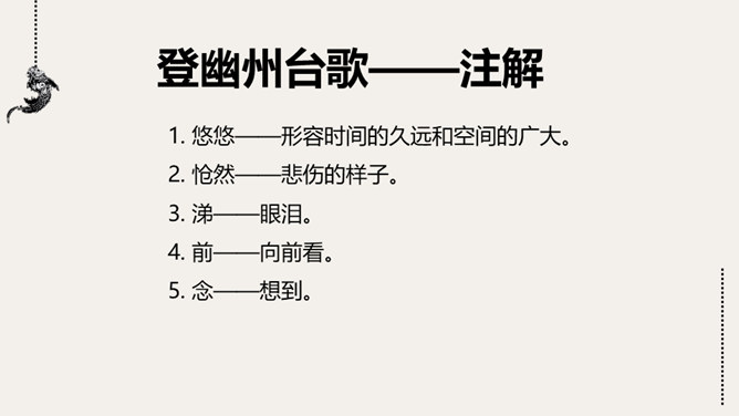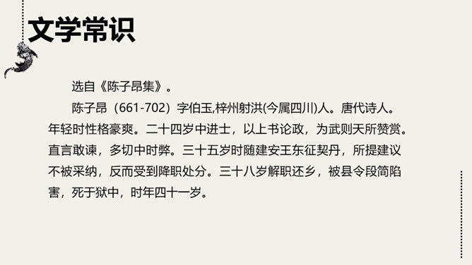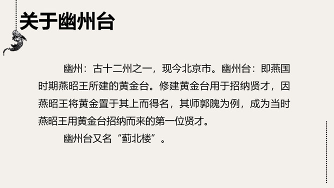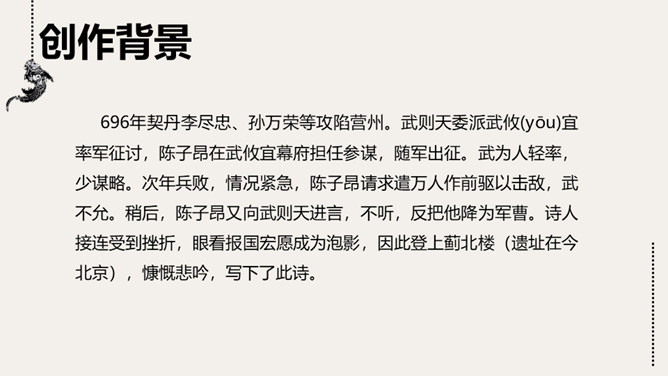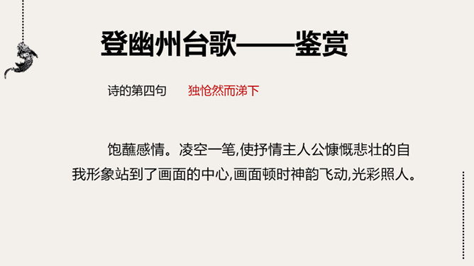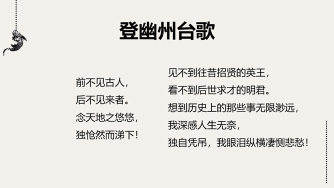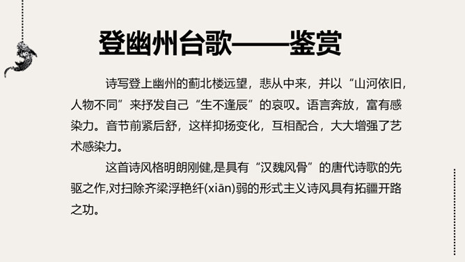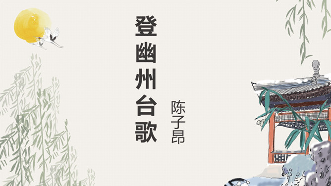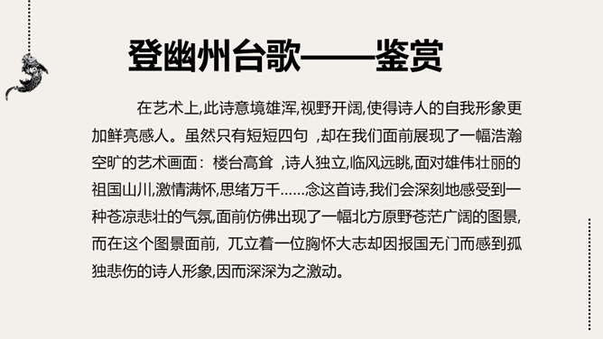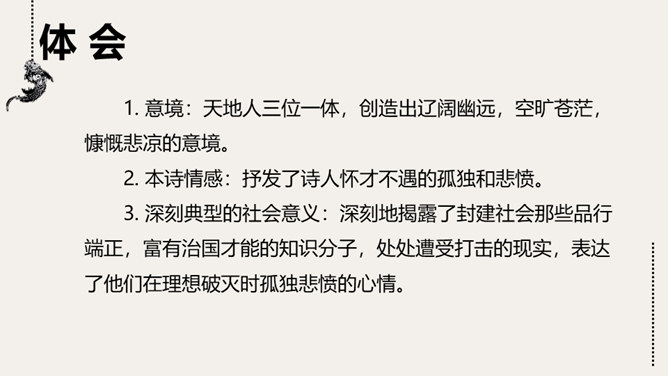 在艺术上,此诗意境雄浑,视野开阔,使得诗人的自我形象更加鲜亮感人。虽然只有短短四句 ,却在我们面前展现了一幅浩瀚空旷的艺术画面:楼台高耸 ,诗人独立,临风远眺,面对雄伟壮丽的祖国山川,激情满怀,思绪万千……念这首诗,我们会深刻地感受到一种苍凉悲壮的气氛,面前仿佛出现了一幅北方原野苍茫广阔的图景,而在这个图景面前, 兀立着一位胸怀大志却因报国无门而感到孤独悲伤的诗人形象,因而深深为之激动。所属专题:登幽州台歌ppt。