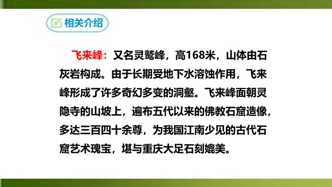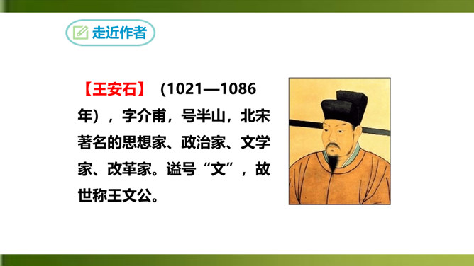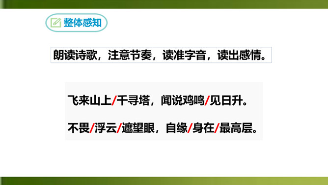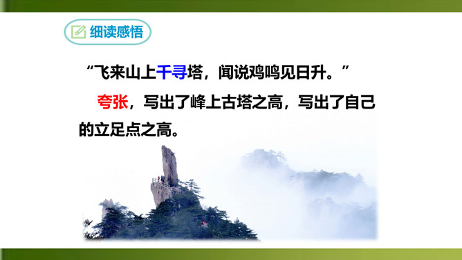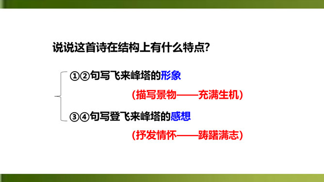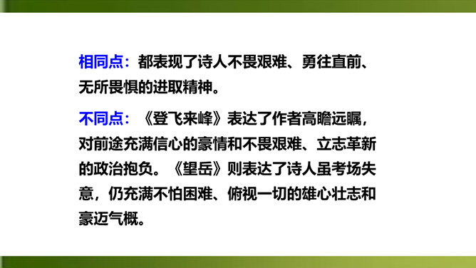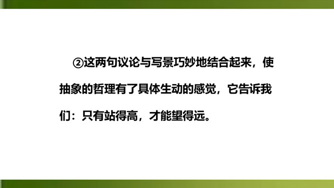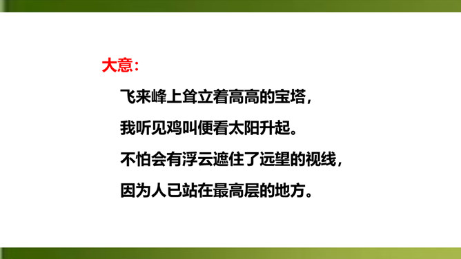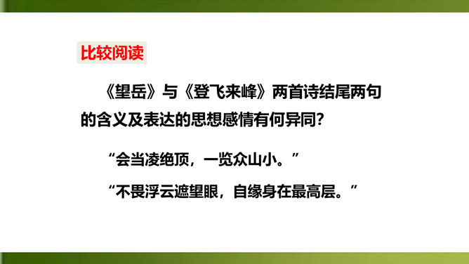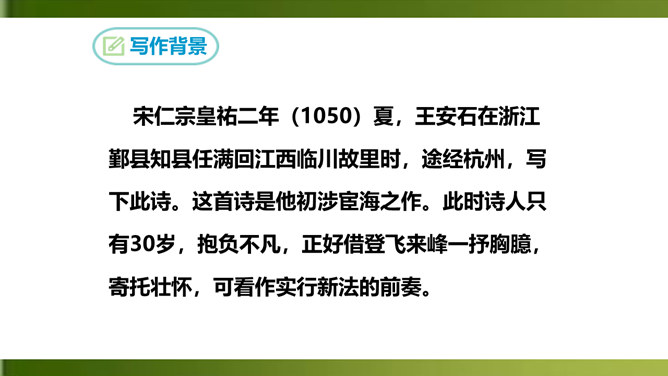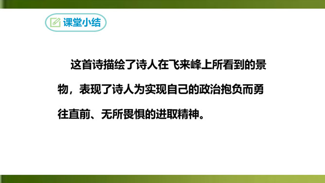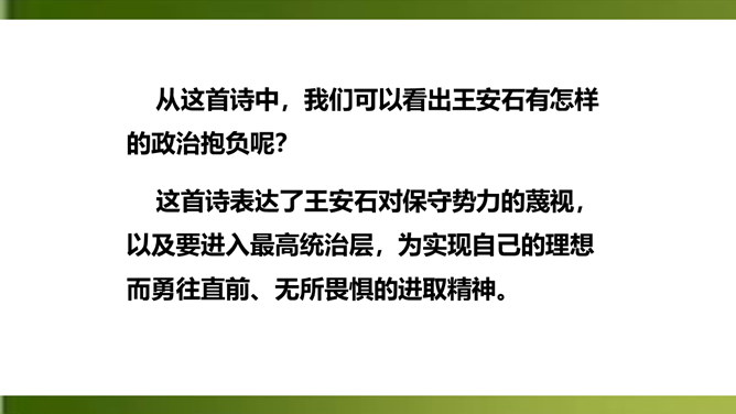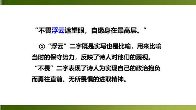 夸张,写出了峰上古塔之高,写出了自己的立足点之高。浮云”二字既是实写也是比喻,用来比喻当时的保守势力,反映了诗人对他们的蔑视。“不畏”二字表现了诗人为实现自己的政治抱负而勇往直前、无所畏惧的进取精神。这两句议论与写景巧妙地结合起来,使抽象的哲理有了具体生动的感觉,它告诉我们:只有站得高,才能望得远。从这首诗中,我们可以看出王安石有怎样的政治抱负呢?这首诗表达了王安石对保守势力的蔑视,以及要进入最高统治层,为实现自己的理想而勇往直前、无所畏惧的进取精神。所属专题:登飞来峰ppt。