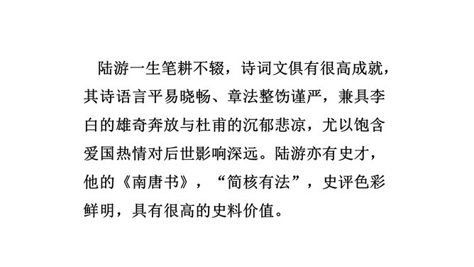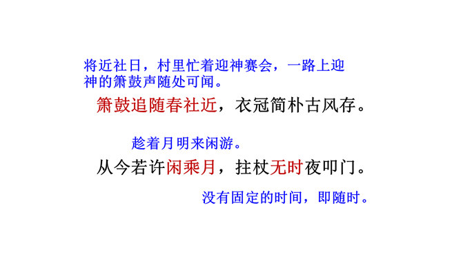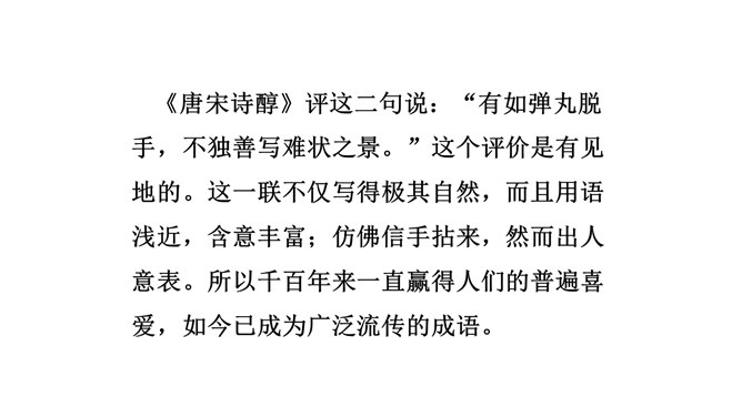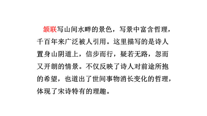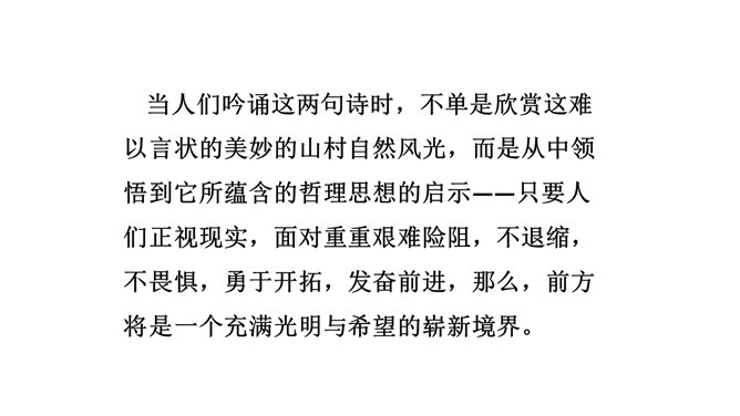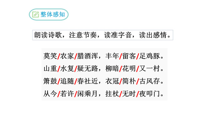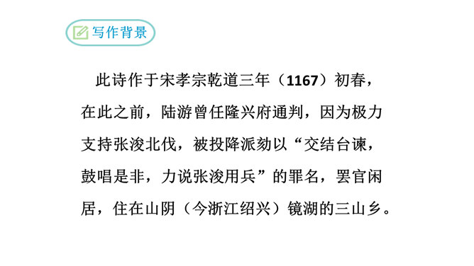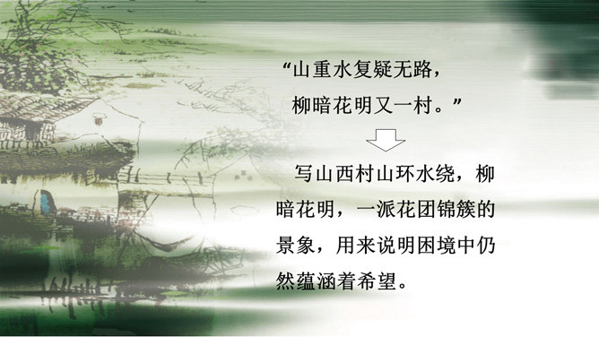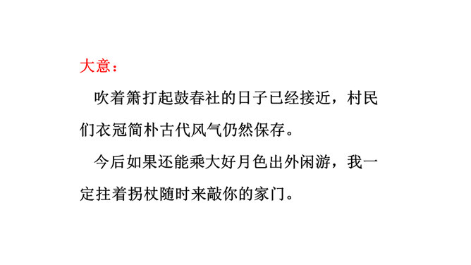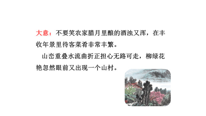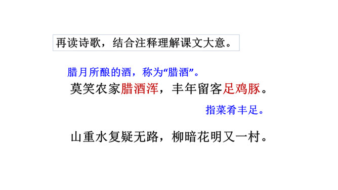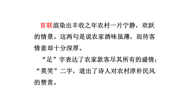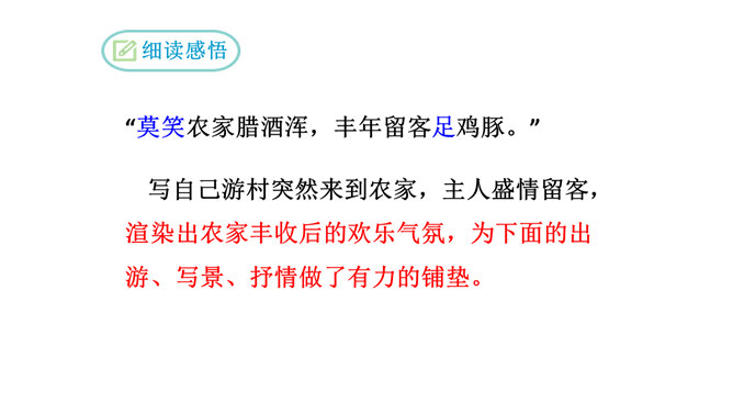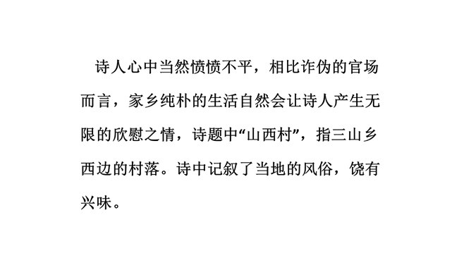 诗人心中当然愤愤不平,相比诈伪的官场而言,家乡纯朴的生活自然会让诗人产生无限的欣慰之情,诗题中“山西村”,指三山乡西边的村落。诗中记叙了当地的风俗,饶有兴味。写自己游村突然来到农家,主人盛情留客,渲染出农家丰收后的欢乐气氛,为下面的出游、写景、抒情做了有力的铺垫。首联渲染出丰收之年农村一片宁静,欢跃的情景。这两句是说农家酒味虽薄,而待客情意却十分深厚。“足”字表达了农家款客尽其所有的盛情;“莫笑”二字,道出了诗人对农村淳朴民风的赞赏。