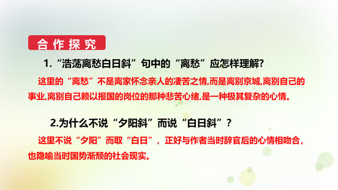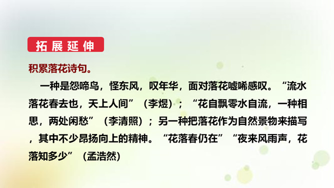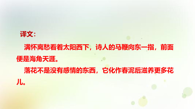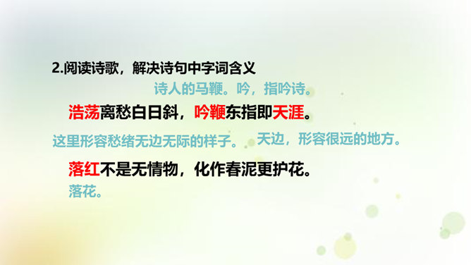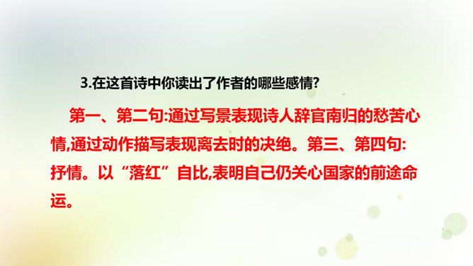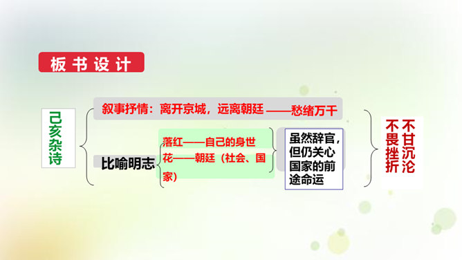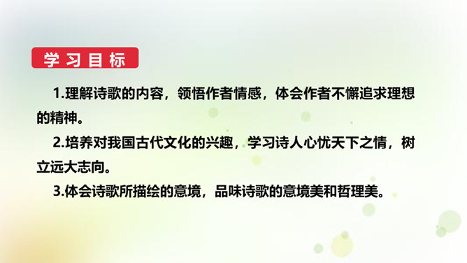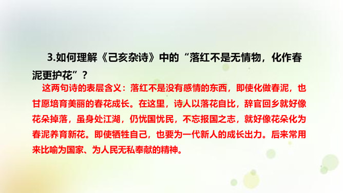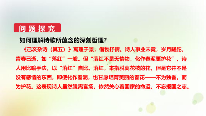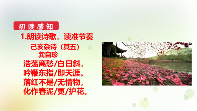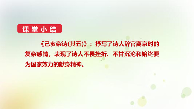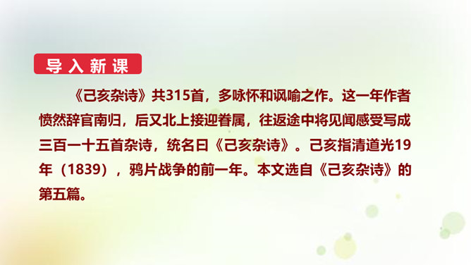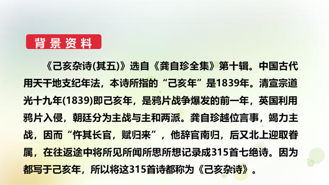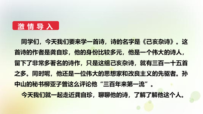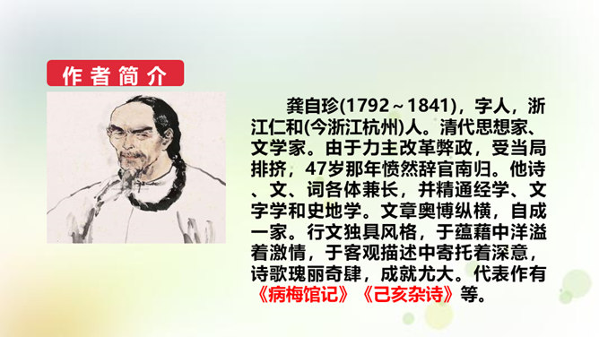 同学们,今天我们要来学一首诗。这首诗的作者是龚自珍,他的身份比较多元,他是一个伟大的诗人,留下了非常多著名的诗作,只是这组己亥杂诗,就有三百一十五首之多。同时呢,他还是一位伟大的思想家和改良主义的先驱者。孙中山的秘书柳亚子曾这么评论他“三百年来第一流”。 今天我们就一起走近龚自珍,聊聊他的诗,了解了解他这个人。1.理解诗歌的内容,领悟作者情感,体会作者不懈追求理想的精神。2.培养对我国古代文化的兴趣,学习诗人心忧天下之情,树立远大志向。3.体会诗歌所描绘的意境,品味诗歌的意境美和哲理美。所属专题:己亥杂诗ppt。