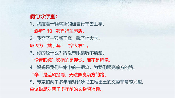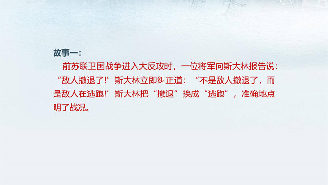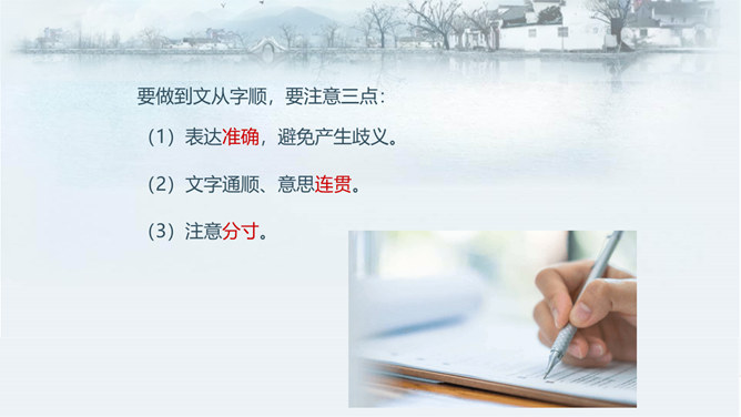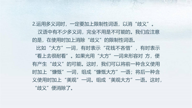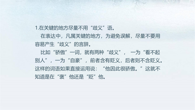 如何做到用语准确?1.在关键的地方尽量不用“歧义”语。在表达中,凡属关键的地方,为避免误解,尽量不要用容易产生“歧义”的言辞。比如“骄傲”一词,就有两种“歧义”, 一为“看不起别人”,一为“自豪”,前者含有贬义,后者则不含贬义。这样的词语如果直接运用说:“他因此很骄傲。”这就不知道是在“褒”他还是“贬”他。2.运用多义词时,一定要加上限制性词语,以消“歧义”。汉语中有不少多义词,完全不用是不可能的。我们应注意的是,在使用时加上消除“歧义”的限制性词语。所属专题:文从字顺ppt。