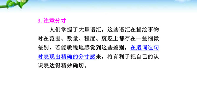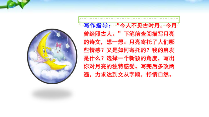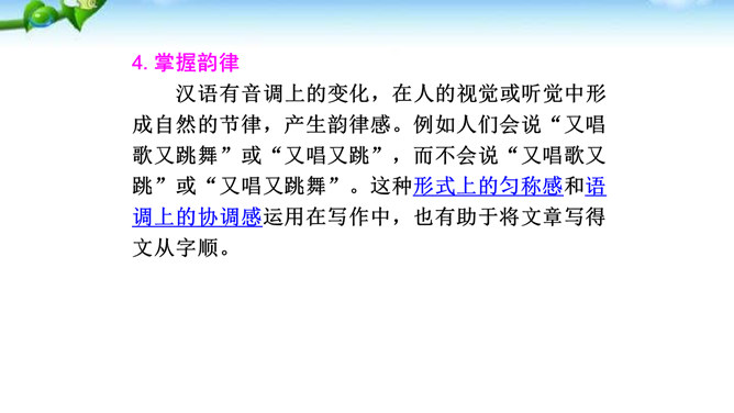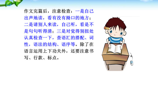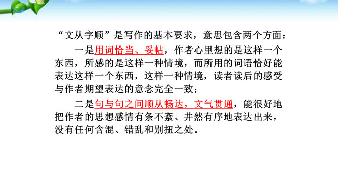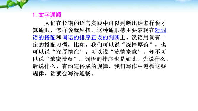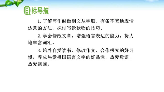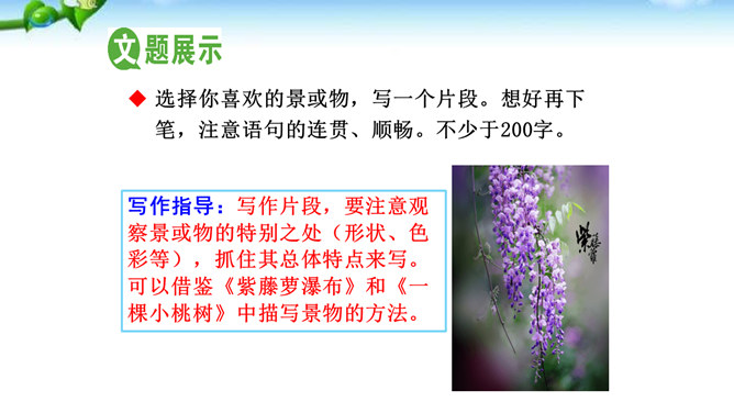 1.了解写作时做到文从字顺、有条不紊地表情达意的方法,探讨写景状物的技巧。2.学会修改文章,增强语言表达的能力,努力地丰富词汇。3.培养自觉读书、修改作文、合作探究的好习惯,养成热爱祖国语言文字的好品性,热爱母语,热爱祖国。写作指导:扩展写作时,可以借鉴课文的写法,想好从哪几个方面来写出景物的特点,要表达怎样的思想感情,力求做到景美情真。人们在长期的语言实践中可以判断出话怎样说才算通顺,怎样说就别扭。这种通顺感主要表现在对词语的搭配和词语的排序正误的判断上。所属专题:文从字顺ppt。