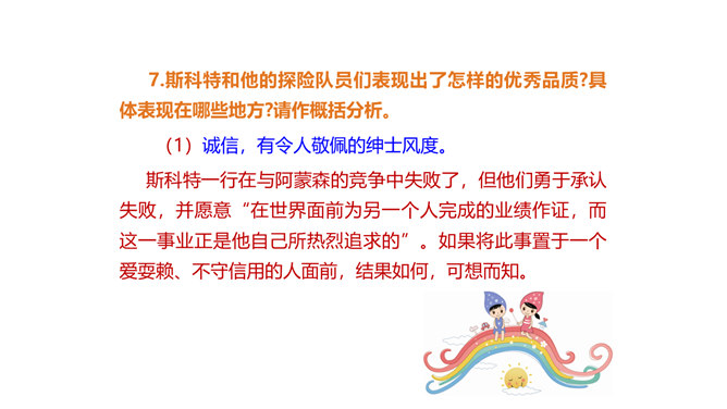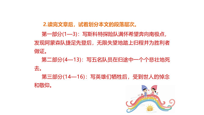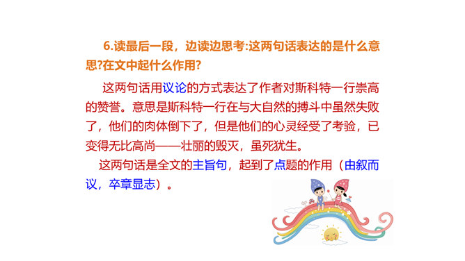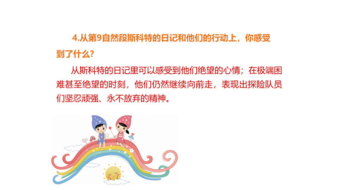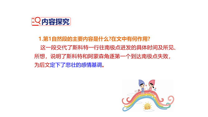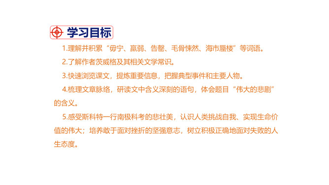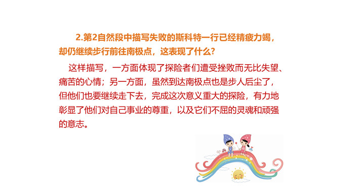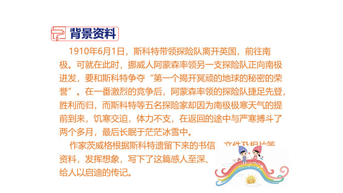 茨威格为何不给胜利者阿蒙森作传,却充满激情地为失败者斯科特书写这悲壮的一幕?这可以从课文的最后两句话中找到答案:“一个人虽然在同不可战胜的厄运的搏斗中毁灭了自己,但他的心灵却因此变得无比高尚。所有这些在一切时代都是最伟大的悲剧。”作为一位伟大的作家,茨威格想到的绝不仅仅是事业的成功者,还有许多“失败者”,他们及其背后的故事同样能给人精神上的震撼和启迪。按照这个价值标准,茨威格当然认为给斯科特作传会更有意义,会给世人更强烈的震撼和更长久的思考。所属专题:伟大的悲剧ppt。