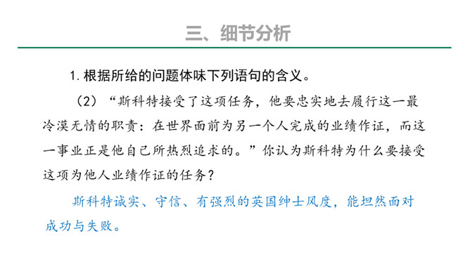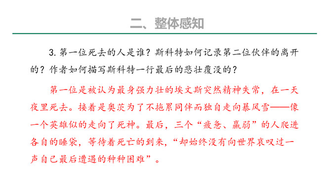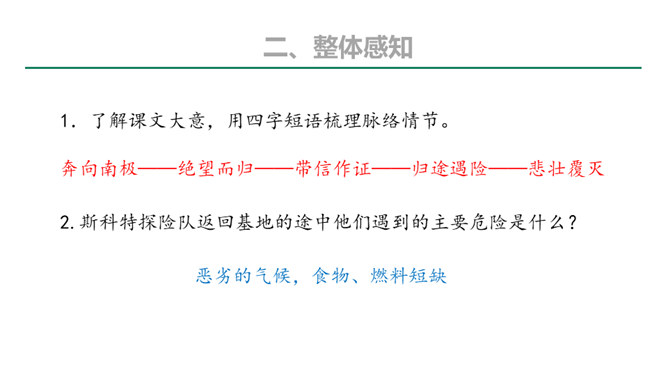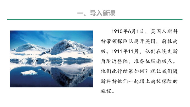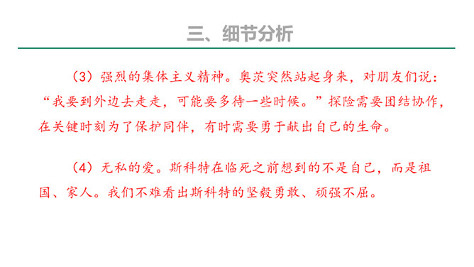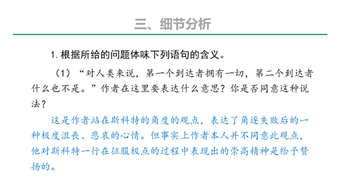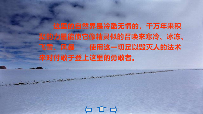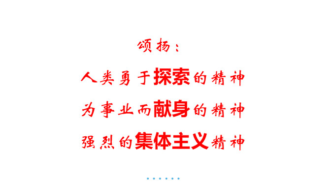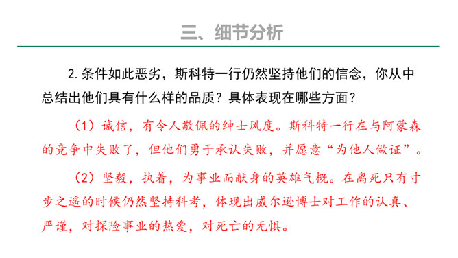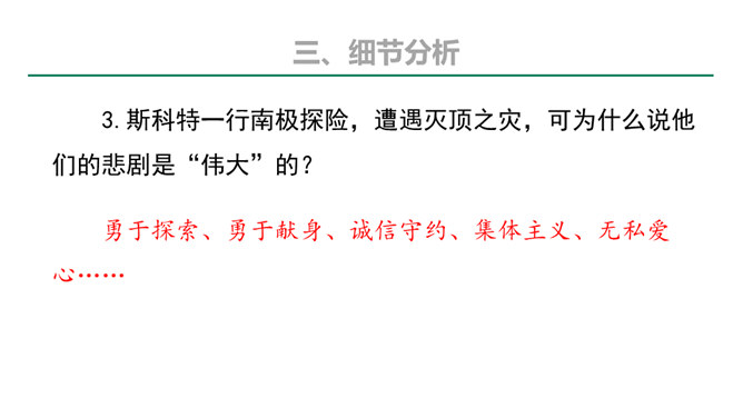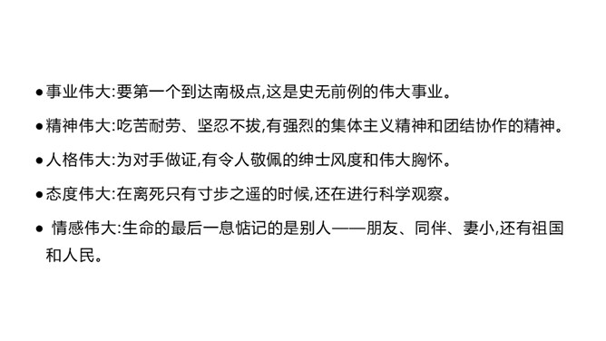 本文的探险员在经历了一次次的困难,度过了严寒,躲过了浮冰的撞击,最终成为登上欧亚大陆最北点的英雄;《伟大的悲剧》斯科特一行在与大自然的搏斗中虽然失败并牺牲,但却都显示了人类团结协作、坚韧不拔、勇于探索的崇高品质。在人类探索自然科学奥秘的进程中,固然有成功,有失败。但只要你在前进的道路上不懈地追求,勇于探索,就应该觉得虽败犹荣。从这个意义上讲,追求科学,探索自然,没有失败可言。或者说“成也英雄,败也英雄”。希望同学们热爱自然,热爱科学,不怕失败,勇于探索。所属专题:伟大的悲剧ppt。