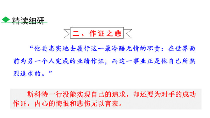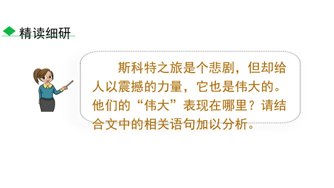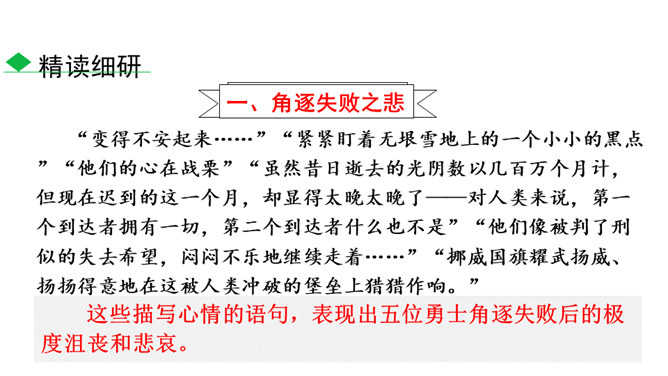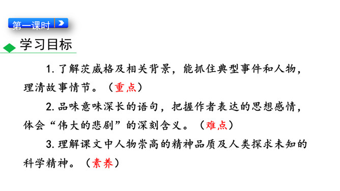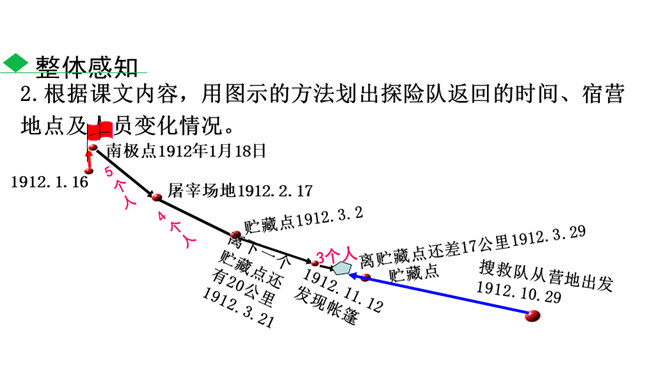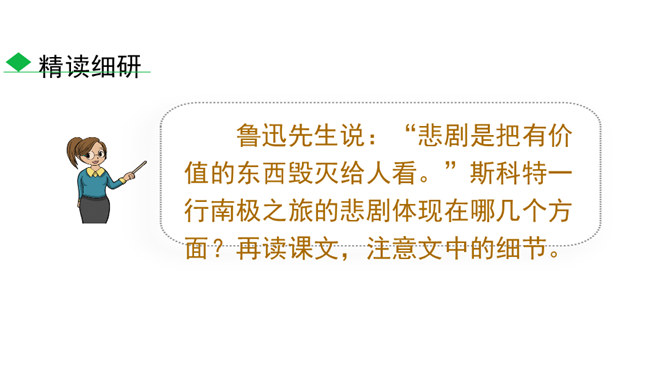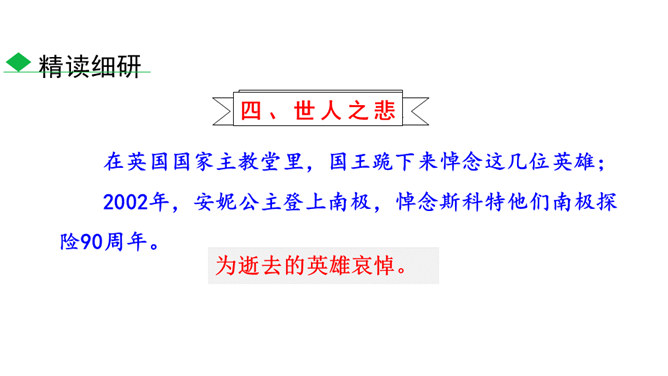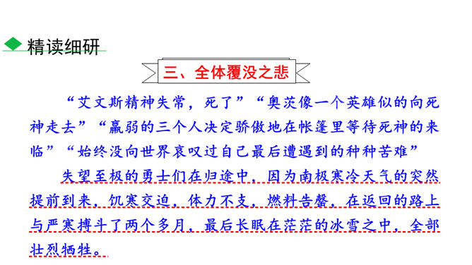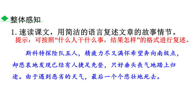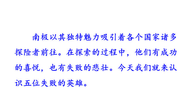 南极以其独特魅力吸引着各个国家诸多探险者前往。在探索的过程中,他们有成功的喜悦,也有失败的悲壮。今天我们就来认识五位失败的英雄。1.了解茨威格及相关背景,能抓住典型事件和人物,理清故事情节。(重点)2.品味意味深长的语句,把握作者表达的思想感情,体会“伟大的悲剧”的深刻含义。(难点)3.理解课文中人物崇高的精神品质及人类探求未知的科学精神。(素养)速读课文,用简洁的语言复述文章的故事情节。斯科特探险队五人,精疲力尽又满怀希望奔向南极点,却悲哀地发现已经有人捷足先登,只好垂头丧气地踏上归途。所属专题:伟大的悲剧ppt。