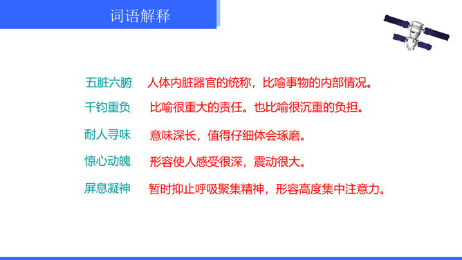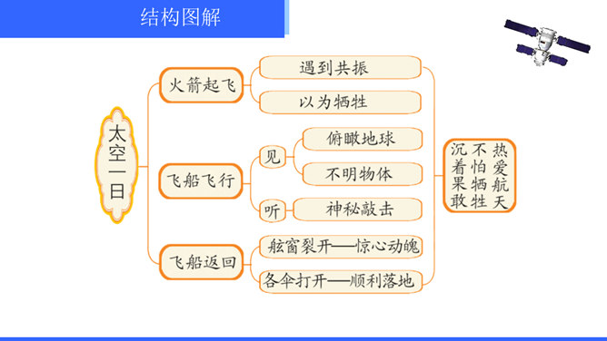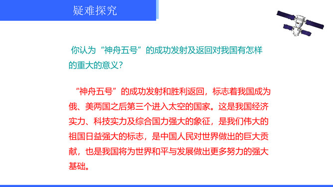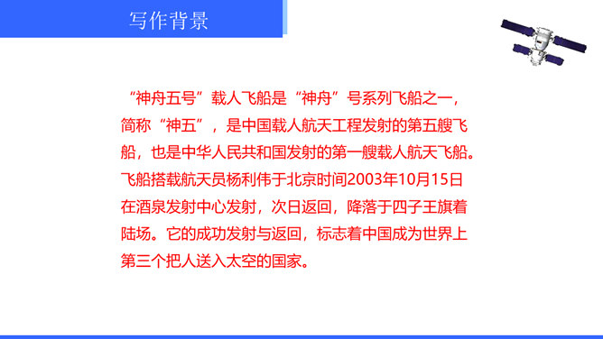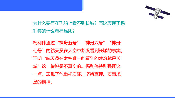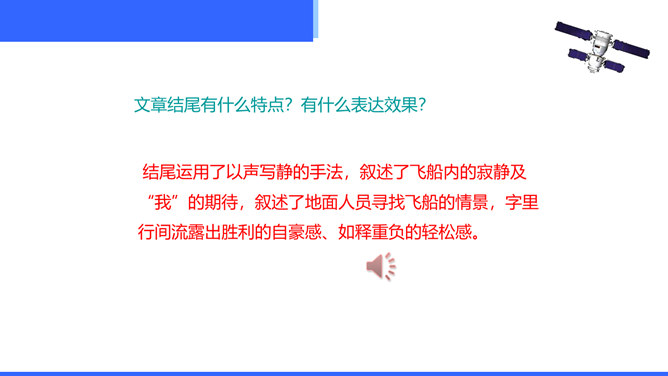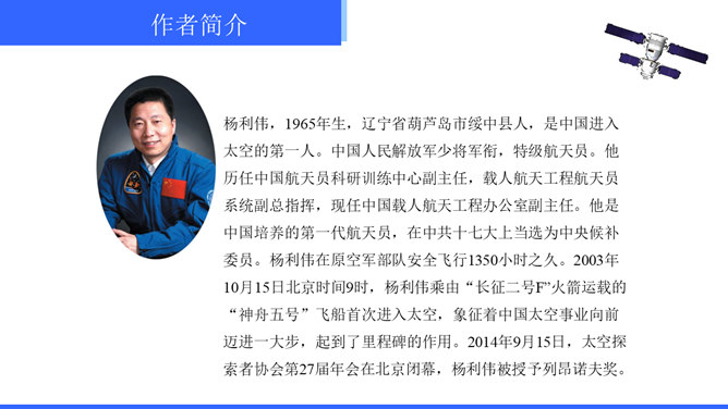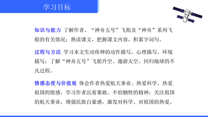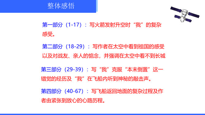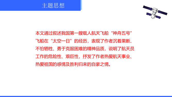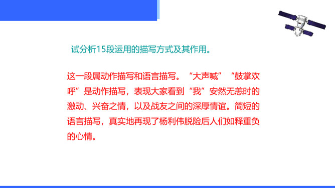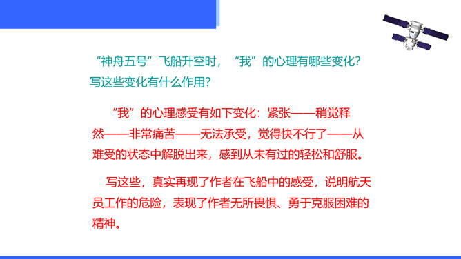 “神舟五号”飞船升空时,“我”的心理有哪些变化?写这些变化有什么作用?“我”的心理感受有如下变化:紧张——稍觉释然——非常痛苦——无法承受,觉得快不行了——从难受的状态中解脱出来,感到从未有过的轻松和舒服。写这些,真实再现了作者在飞船中的感受,说明航天员工作的危险,表现了作者无所畏惧、勇于克服困难的精神。试分析15段运用的描写方式及其作用。这一段属动作描写和语言描写。“大声喊”“鼓掌欢呼”是动作描写,表现大家看到“我”安然无恙时的激动、兴奋之情,以及战友之间的深厚情谊。所属专题:太空一日ppt。