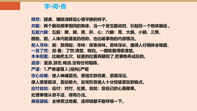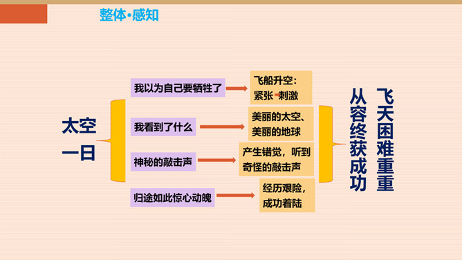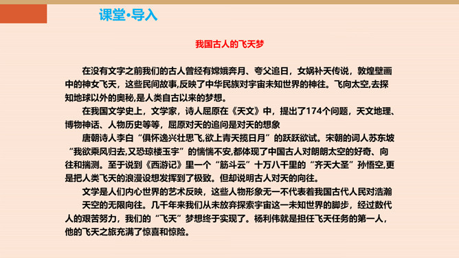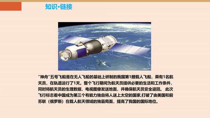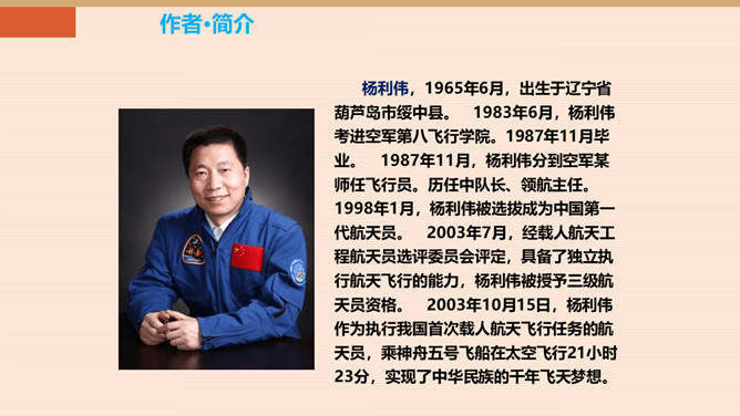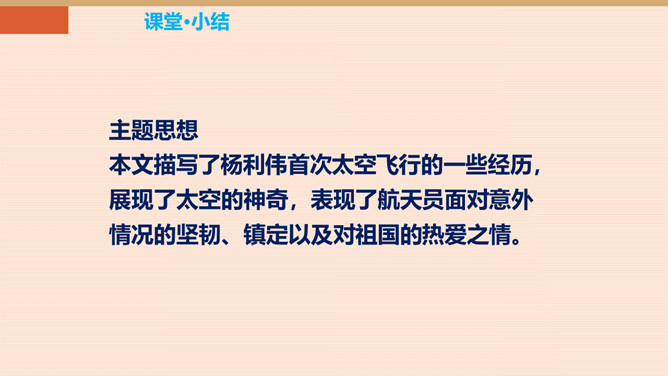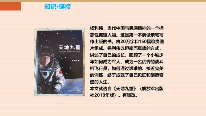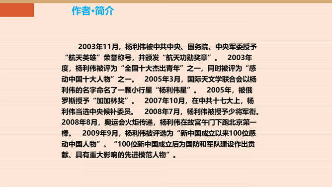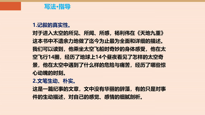 记叙的真实性。对于进入太空的所见、所闻、所感,杨利伟在《天地九重》这本书中不遗余力地做了迄今为止最为全面和详细的描述。我们可以读到,他乘坐太空飞船时奇妙的身体感受,他在太空飞行14圈,经历了地球上14个昼夜看见了怎样的太空奇景,他在太空中遇到了什么样的危险与痛苦,经历了哪些惊心动魄的时刻。文笔生动、朴实。这是一篇纪事的文章,文中没有华丽的辞藻,有的只是对事件的生动描述,对自己的感觉、感情的细腻剖析。所属专题:太空一日ppt。