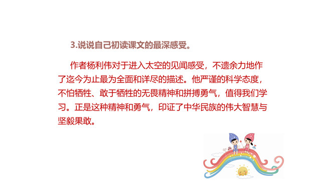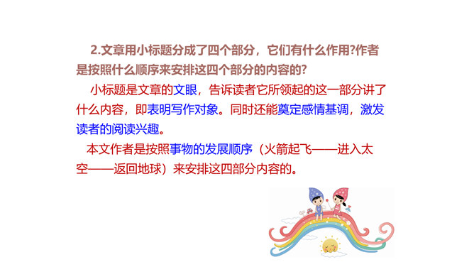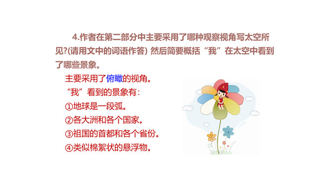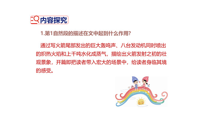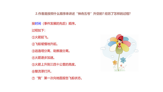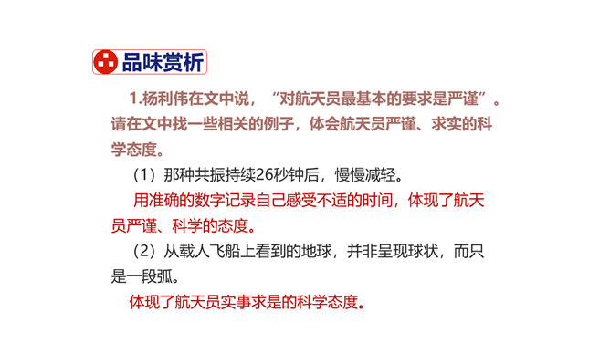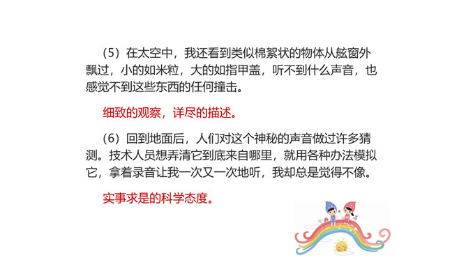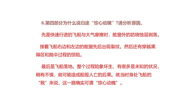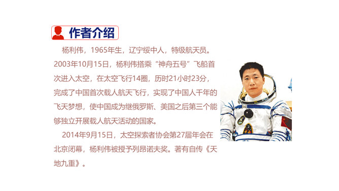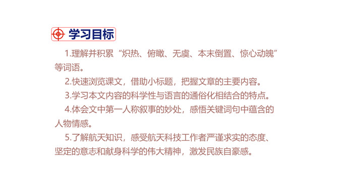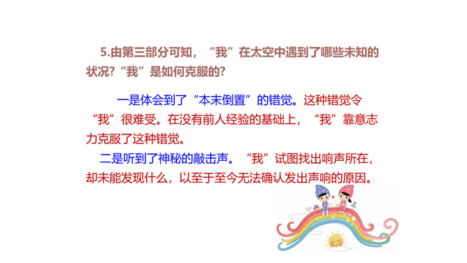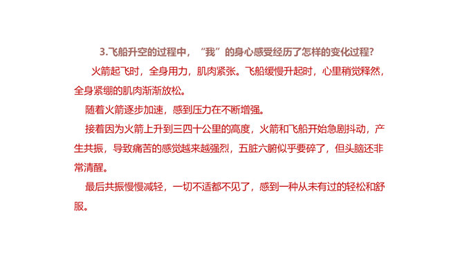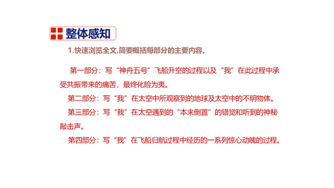 快速浏览全文,简要概括每部分的主要内容。第一部分:写“神舟五号”飞船升空的过程以及“我”在此过程中承受共振带来的痛苦,最终化险为夷。第二部分:写“我”在太空中所观察到的地球及太空中的不明物体。第三部分:写“我”在太空遇到的“本末倒置”的错觉和听到的神秘敲击声。第四部分:写“我”在飞船归航过程中经历的一系列惊心动魄的过程。文章用小标题分成了四个部分,它们有什么作用?作者是按照什么顺序来安排这四个部分的内容的? 小标题是文章的文眼,告诉读者它所领起的这一部分讲了什么内容,即表明写作对象。所属专题:太空一日ppt。