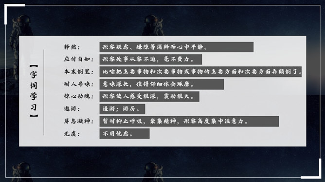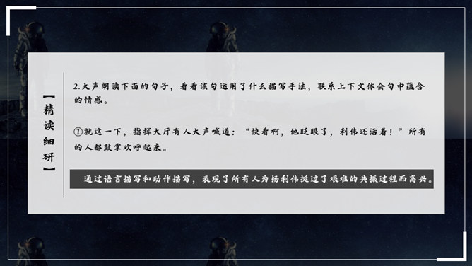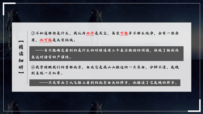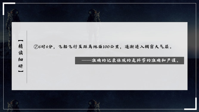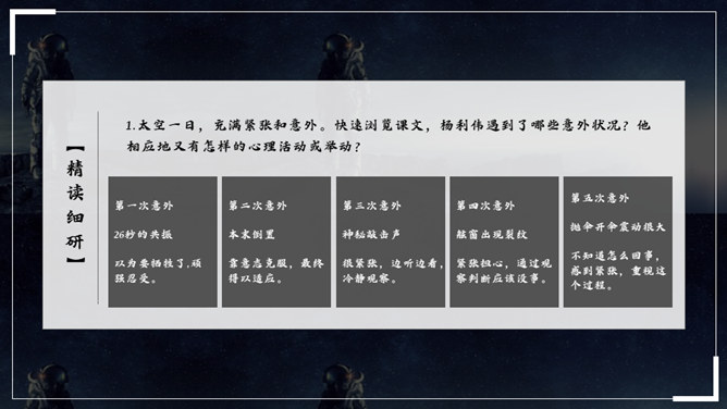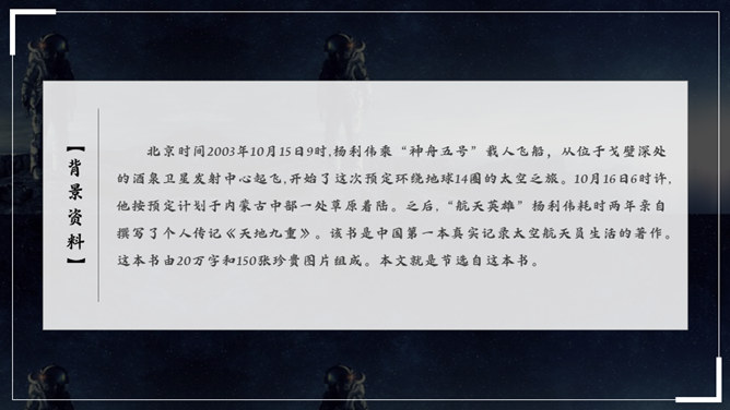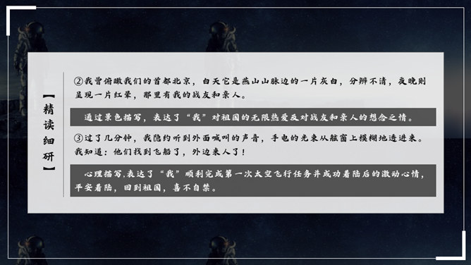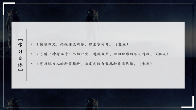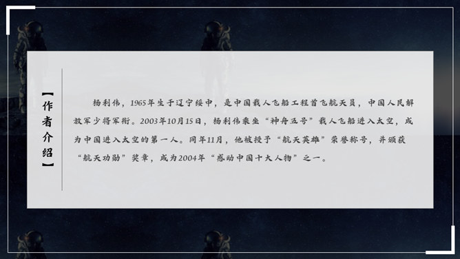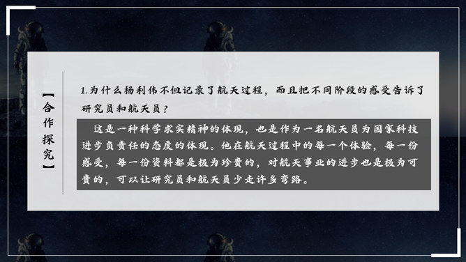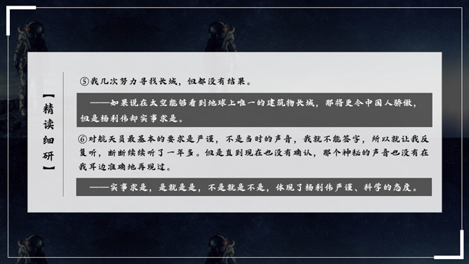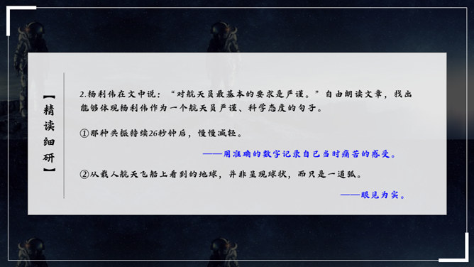 杨利伟给你留下了什么印象?读完课文,你有什么感想? 从文中我们可以看到杨利伟坚韧、一丝不苟、不怕牺牲、敢于牺牲的无畏精神和拼搏勇气,正是这种精神和勇气,印证了中华民族的伟大智慧与坚毅果敢。在杨利伟身上凸显出来的中国载人航天精神,是中华民族实现伟大复兴的征程中不可或缺的、用之不竭的精神财富。当不能确定看到的是什么的时候连用三个表示推测的词语,体现了杨利伟表达时语言的严谨性。所属专题:太空一日ppt。
