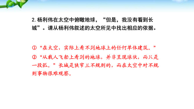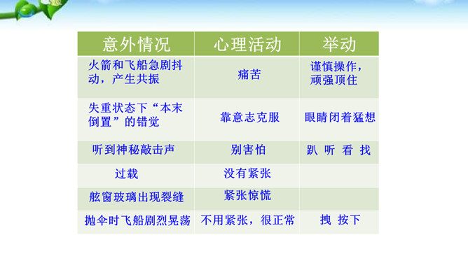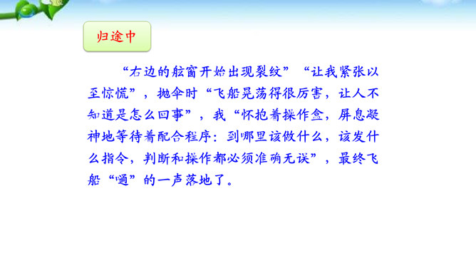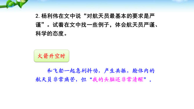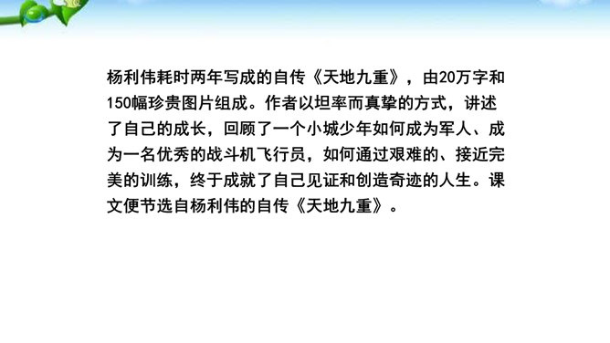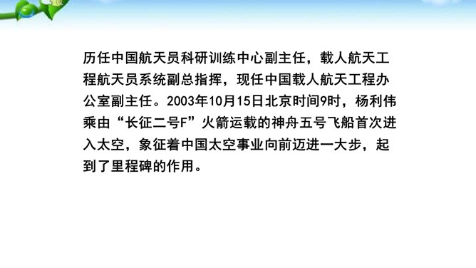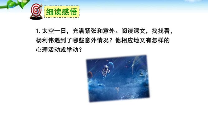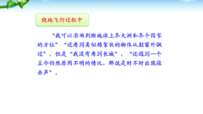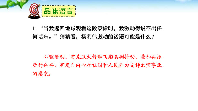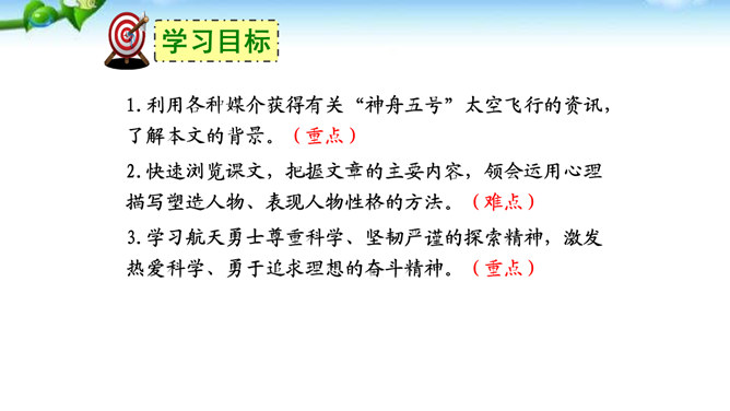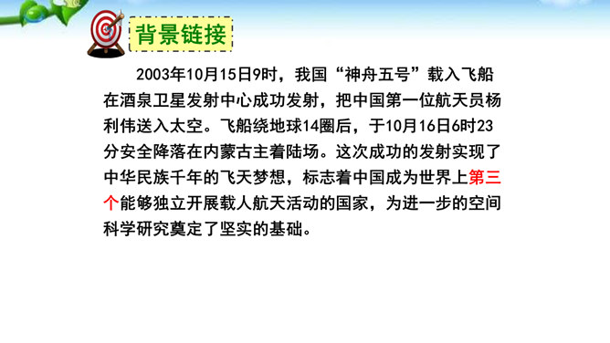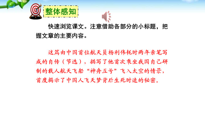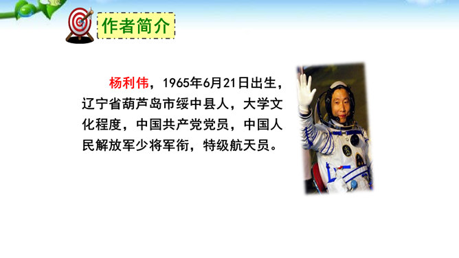 1.利用各种媒介获得有关“神舟五号”太空飞行的资讯,了解本文的背景。(重点)2.快速浏览课文,把握文章的主要内容,领会运用心理描写塑造人物、表现人物性格的方法。(难点)3.学习航天勇士尊重科学、坚韧严谨的探索精神,激发热爱科学、勇于追求理想的奋斗精神。(重点)这篇由中国首位航天员杨利伟耗时两年亲笔写成的自传(节选),描写了他首次乘坐我国自己研制的载人航天飞船“神舟五号”飞入太空的情景,首度揭示了中国人飞天梦背后生死时速的秘密。所属专题:太空一日ppt。