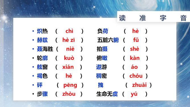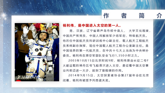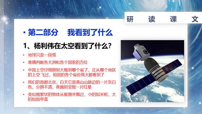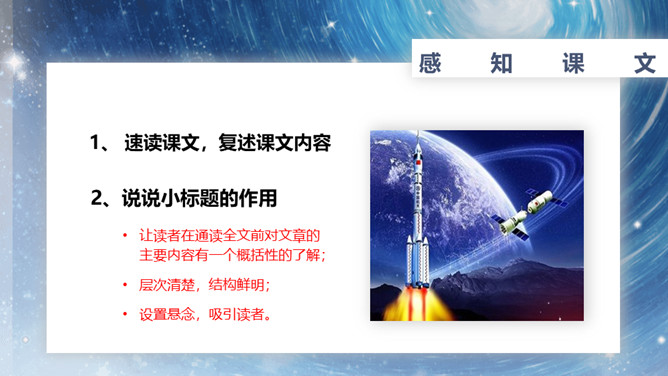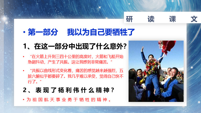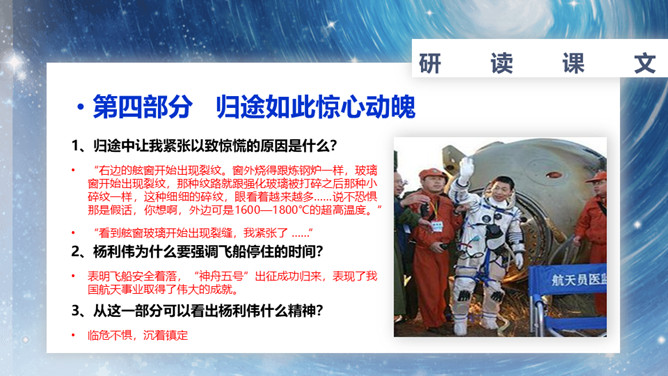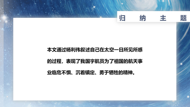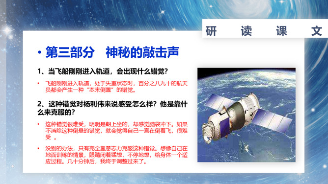 速读课文,复述课文内容。说说小标题的作用。让读者在通读全文前对文章的主要内容有一个概括性的了解;层次清楚,结构鲜明;设置悬念,吸引读者。在这一部分中出现了什么意外?表现了杨利伟什么精神?为祖国航天事业勇于牺牲的精神。杨利伟在太空看到了什么?当飞船刚刚进入轨道,会出现什么错觉?这种错觉对杨利伟来说感受怎么样?他是靠什么来克服的?归途中让我紧张以致惊慌的原因是什么?杨利伟为什么要强调飞船停住的时间?从这一部分可以看出杨利伟什么精神?临危不惧,沉着镇定。所属专题:太空一日ppt。