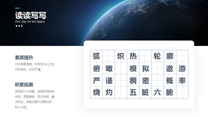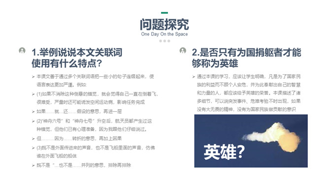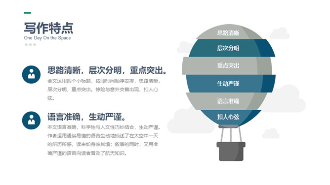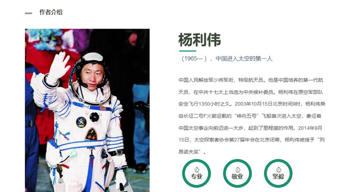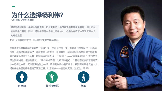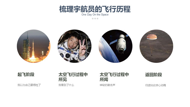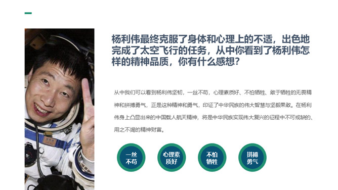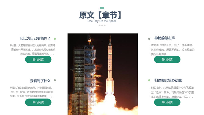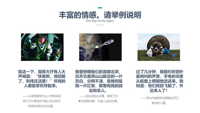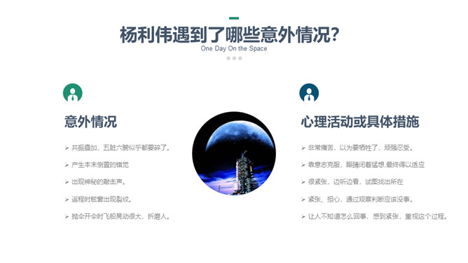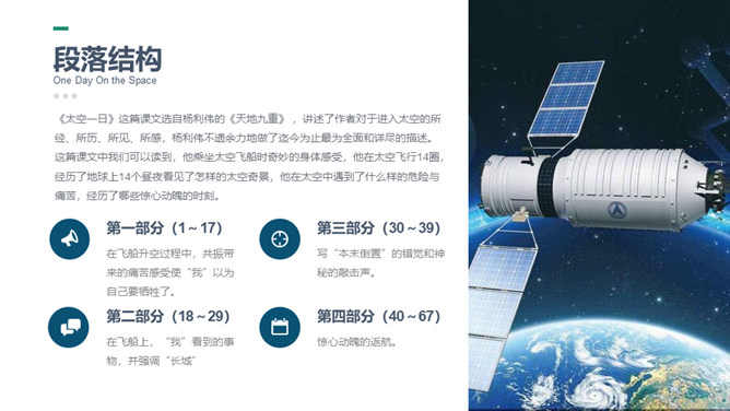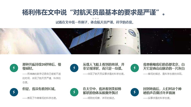 这篇课文选自杨利伟的《天地九重》 ,讲述了作者对于进入太空的所经、所历、所见、所感,杨利伟不遗余力地做了迄今为止最为全面和详尽的描述。这篇课文中我们可以读到,他乘坐太空飞船时奇妙的身体感受,他在太空飞行14圈,经历了地球上14个昼夜看见了怎样的太空奇景,他在太空中遇到了什么样的危险与痛苦,经历了哪些惊心动魄的时刻。思路清晰,层次分明,重点突出。全文运用四个小标题,按照时间顺序安排,思路清晰,层次分明,重点突出。惊险与意外交替出现,扣人心弦。所属专题:太空一日ppt。