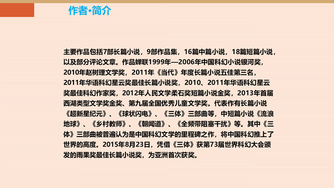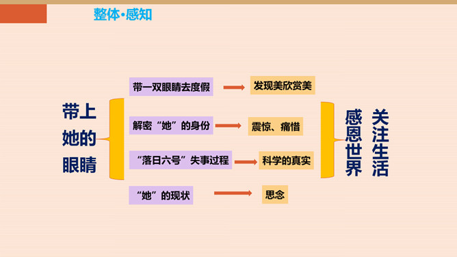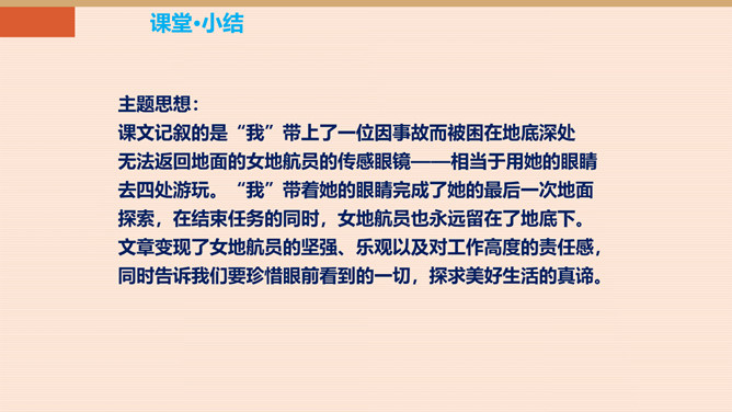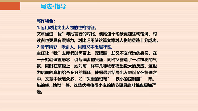 文章通过“我”与她言行的对比,使她这个形象更加生动饱满,对读者也更具有震撼力。对比运用使这篇文章对人物的塑造十分成功。情节精彩,吸引人,同时又不乏趣味性。主任让“我”去度假时再带上一双眼睛,却又不交代她的身份,在一开始就设置悬念,引起读者的兴趣,同时又营造了一种神秘的气氛。同时在草原上,她对每一样平凡事物都做出极大的反应,这也为后面的真相给予充分的解释,使得最后结局出人意料又在情理之中。文章中伏笔众多,如“失重的铅笔”“狭小的控制舱”这些伏笔使得小说的情节更具趣味性也更加严谨。所属专题:带上她的眼睛ppt。