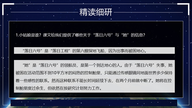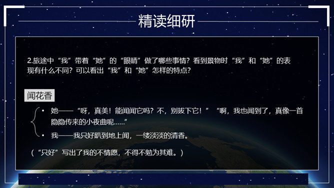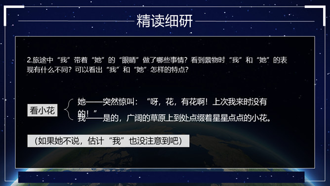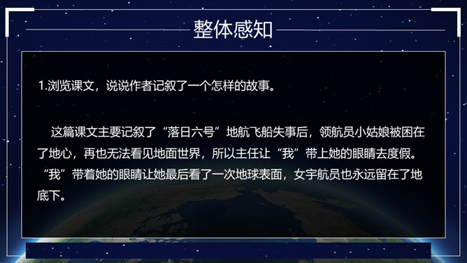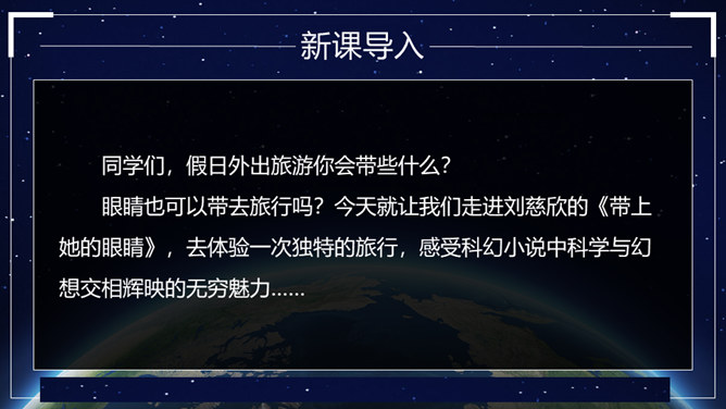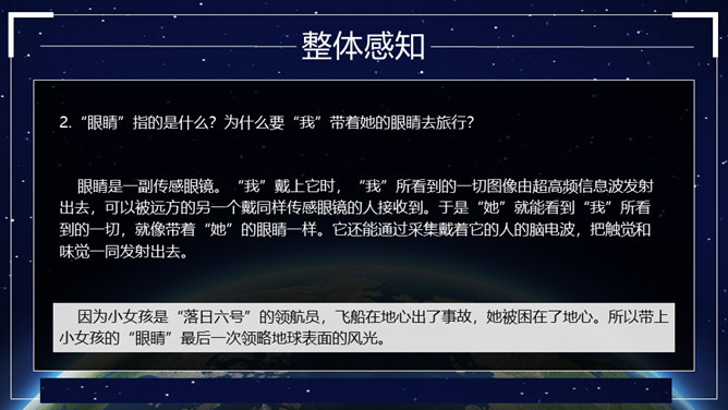 这篇科幻小说通过讲述“我”带一个小姑娘的眼睛去旅行的故事,展现了“落日六号”领航员的不幸遭遇,赞美了小姑娘不怕牺牲、乐观向上、坚持进行科学考察的精神。同时,大自然的严酷与人类的弱小形成了鲜明的对比,正是在极端惨烈的环境中,显示了人性的光辉和魅力,让我们感受到人类探索未知世界的崇高情怀。无论生活多么忙碌,都不要失去对大自然的敏锐的感受力。在工作、学习之余,亲近大自然,发现并珍爱身边一切美好的东西。对于那些无法接触光明的人来说,他们的世界是灰色的。让我们带上他们的“眼睛”,去发现那些如花般美好、绚烂的事物吧。所属专题:带上她的眼睛ppt。