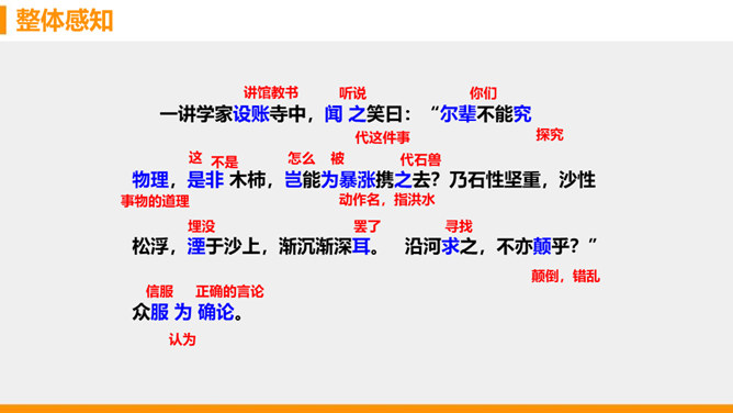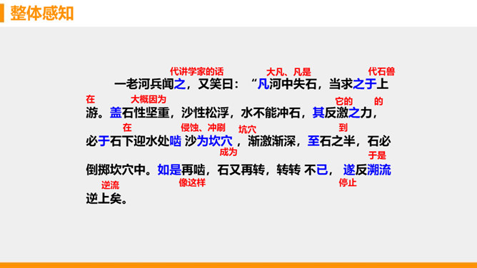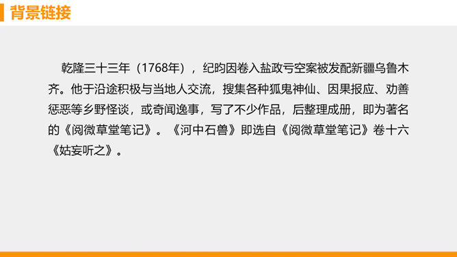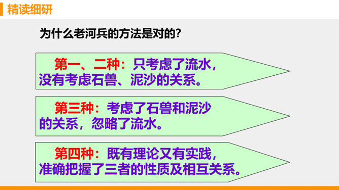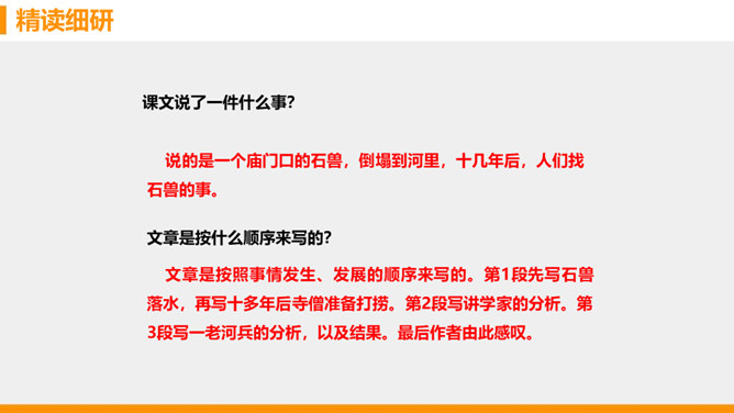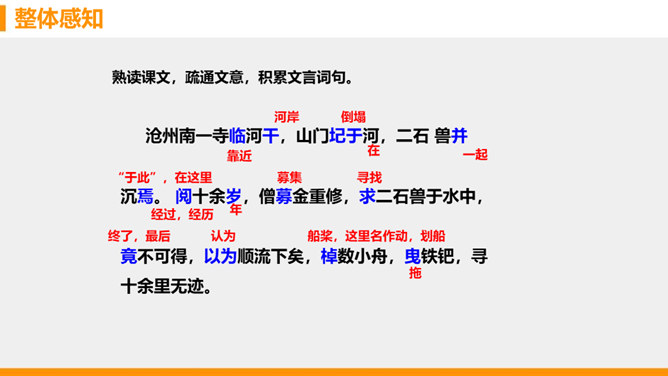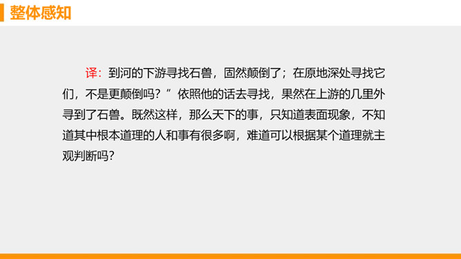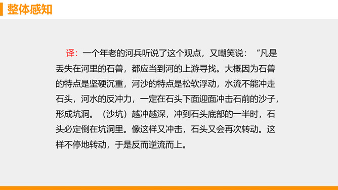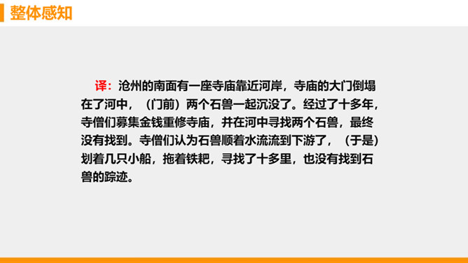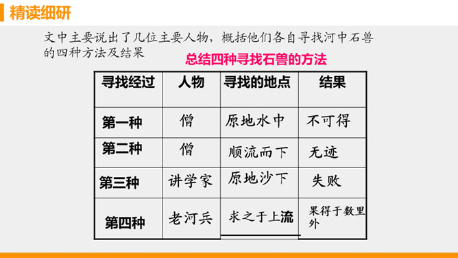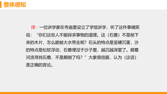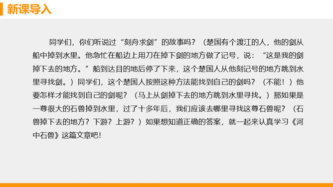 你们听说过“刻舟求剑”的故事吗?(楚国有个渡江的人,他的剑从船中掉到水里。他急忙在船边上用刀在掉下剑的地方做了记号,说:“这是我的剑掉下去的地方。”船到达目的地后停了下来,这个楚国人从他刻记号的地方跳到水里寻找剑。)同学们,这个楚国人按照这种方法能找到自己的剑吗?(不能!)他要怎样才能找到自己的剑呢?(马上从剑掉下去的地方跳到水里寻找。)那如果是一尊很大的石兽掉到水里,过了十多年后,我们应该去哪里寻找这尊石兽呢?(石兽掉下去的地方?下游?上游?)如果想知道正确的答案,就一起来认真学习这篇文章吧!所属专题:河中石兽ppt。