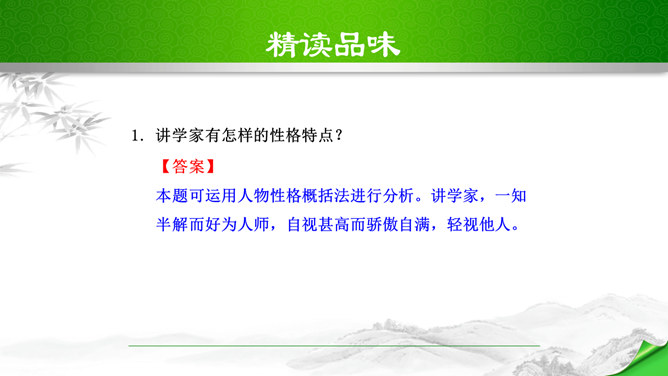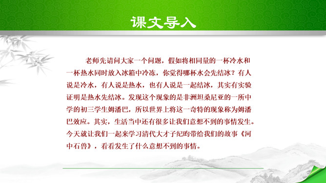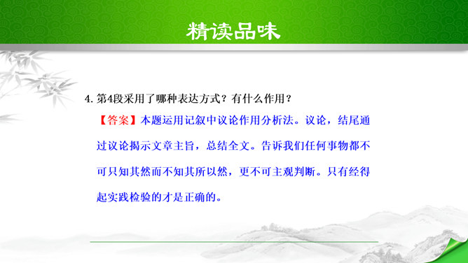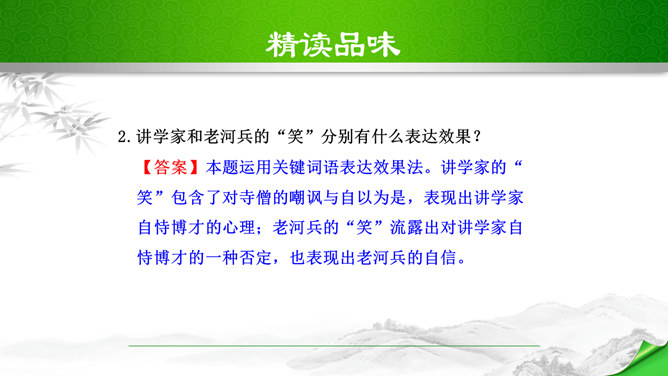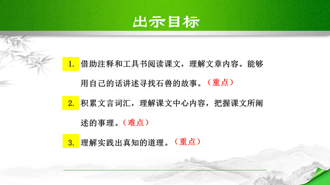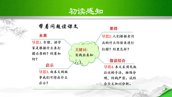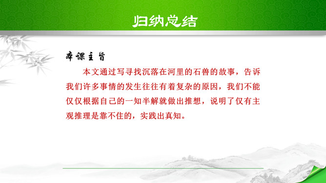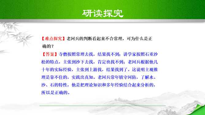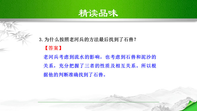 本文脉络分明,逐层深入。文章分四段,正好是四个层次。第一个层次,和尚在石兽沉落处没有找到石兽,又根据物体被水冲向下游的规律,判断石兽已被冲走,驾船往下游寻觅,结果也无所获。紧接着展开第二个层次,设帐讲学的讲学家以博学自夸,嘲笑和尚不懂事物的特性。他分析了石与泥沙的不同特性后,得出石兽深陷在原处的结论。言之凿凿,使听的人“服为确论”。这时,作者笔锋一转,叙述老河兵的分析,使本文深入到第三个层次。老河兵凭他多年治河的实践经验,分析了石头、泥沙和流水的物理属性以及三者之间的关系。所属专题:河中石兽ppt。