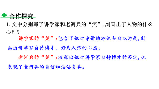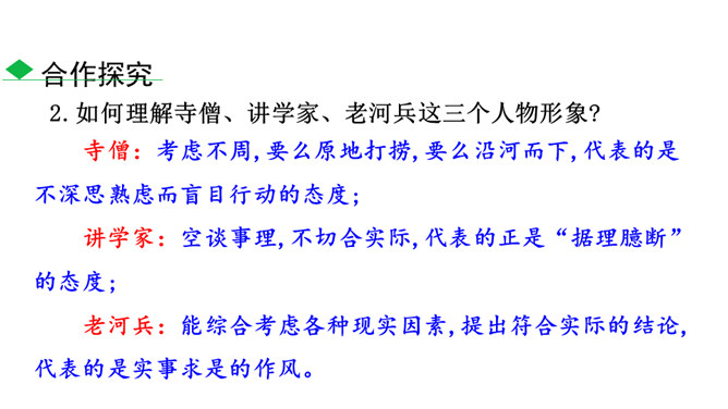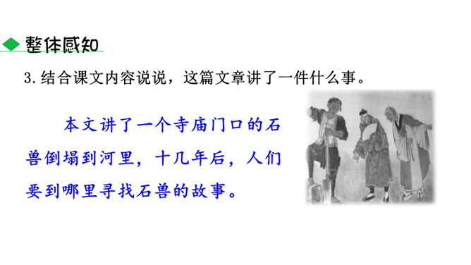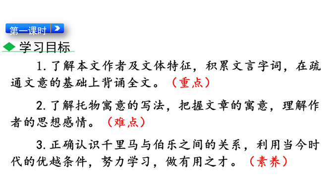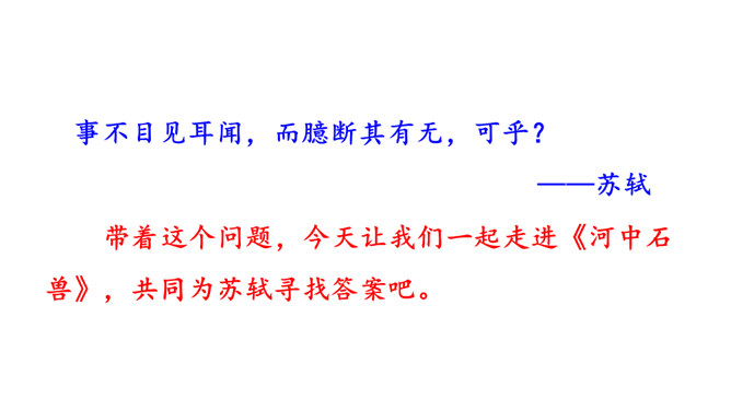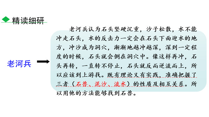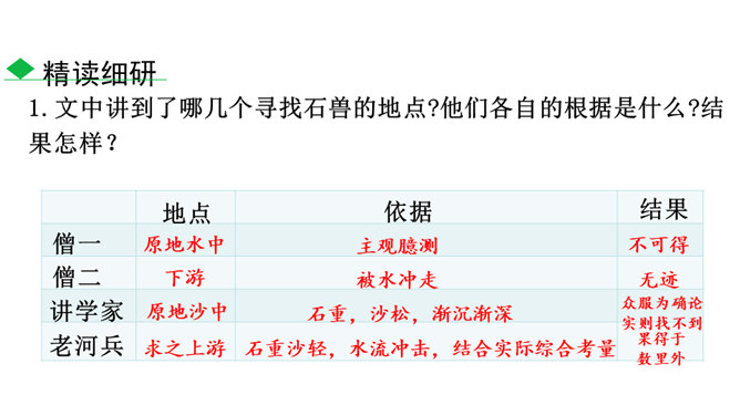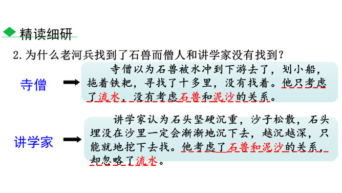 1.了解本文作者及文体特征,积累文言字词,在疏通文意的基础上背诵全文。2.了解托物寓意的写法,把握文章的寓意,理解作者的思想感情。3.正确认识千里马与伯乐之间的关系,利用当今时代的优越条件,努力学习,做有用之才。为什么老河兵找到了石兽而僧人和讲学家没有找到?僧以为石兽被水冲到下游去了,划小船,拖着铁耙,寻找了十多里,没有找着。他只考虑了流水,没有考虑石兽和泥沙的关系。讲学家认为石头坚硬沉重,沙子松散,石头埋没在沙里一定会渐渐地沉下去,越沉越深,只能就地挖下去找。他考虑了石兽和泥沙的关系,却忽略了流水。所属专题:河中石兽ppt。