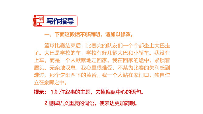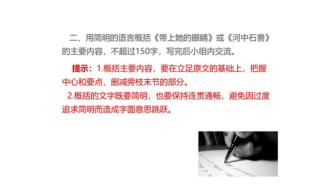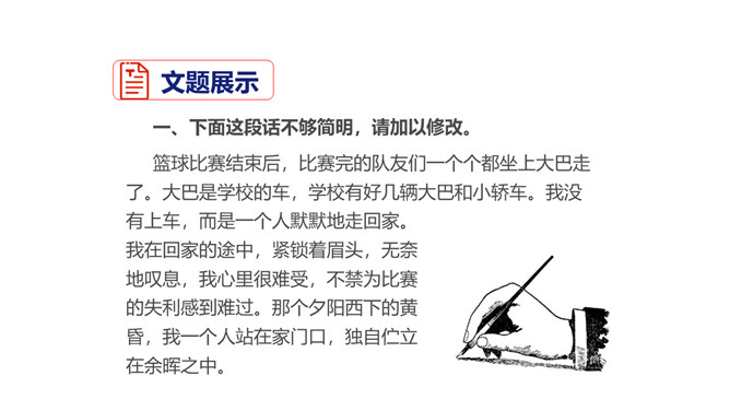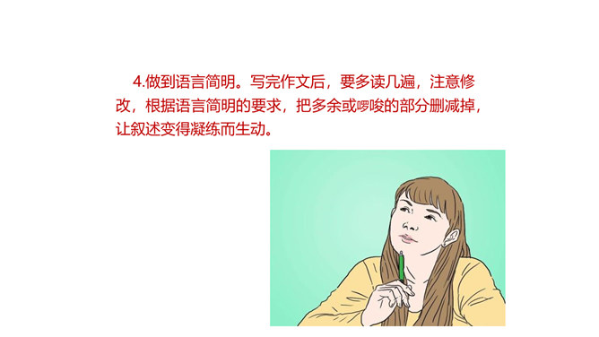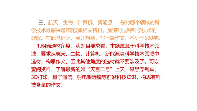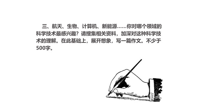1.了解语言简明的基本要求,在比较阅读中体会“简明”的内涵。2.总结阅读经验和写作经验,把握使语言简明的方法技巧。3.修改自己的习作,使其更加简明,培养良好的写作习惯。通过学习和练笔,学会正确、简明地表达自己的观点。航天、生物、计算机、新能源……你对哪个领域的科学技术最感兴趣?请搜集相关资料,加深对这种科学技术的理解。在此基础上,展开想象,写一篇作文。不少于500字。所属专题:语言简明ppt。