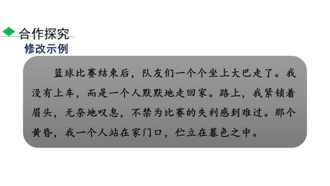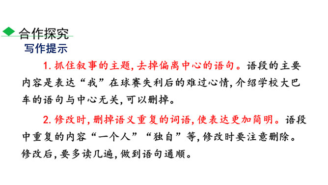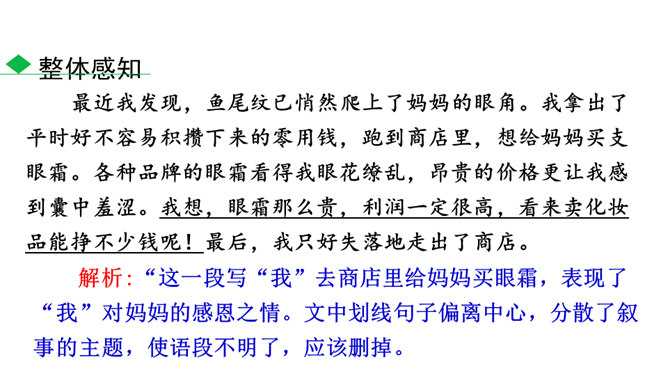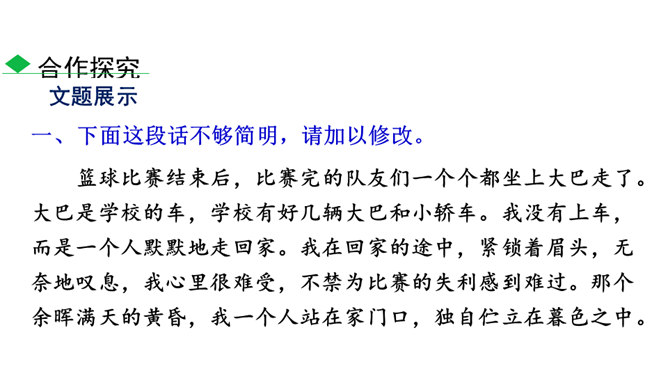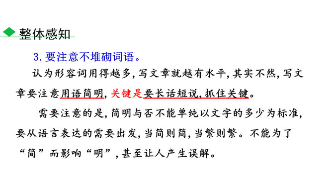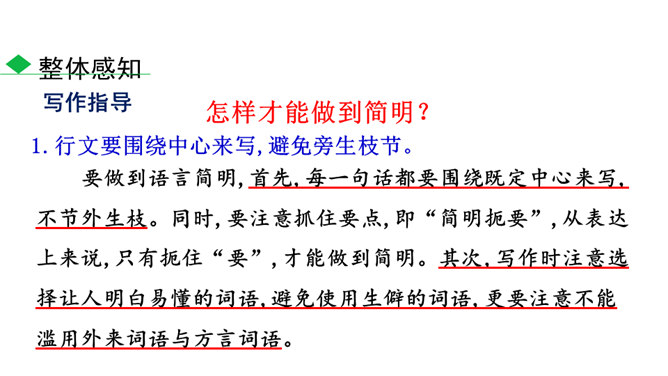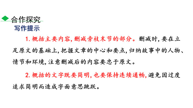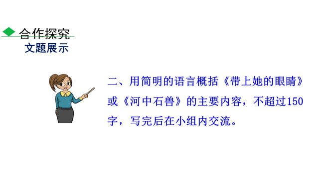 1.概括主要内容,删减旁枝末节的部分。删减时,要在立足原文的基础上,把握文章的中心和要点,归纳故事中的人物、情节和环境,注意删减后的内容要忠于原文。2.概括的文字既要简明,也要保持连续通畅,避免因过度追求简明而造成字面意思跳跃。作者以丰富的想象力、极具新意的构思,向我们介绍了克隆地球的原因、经过,从而表达了对地球环境的忧思。文章结尾发人深省,旨在唤起人们保护地球的忧患意识。所属专题:语言简明ppt。