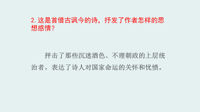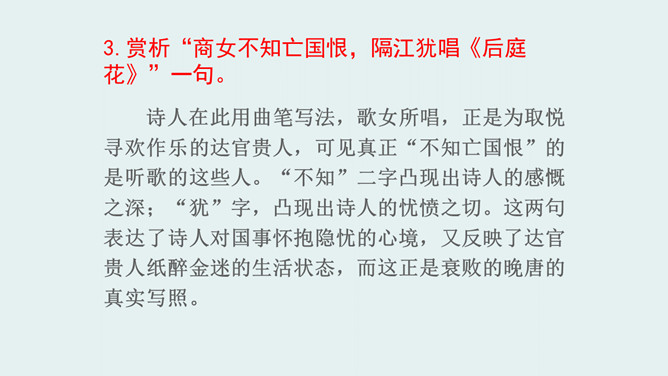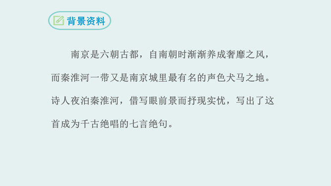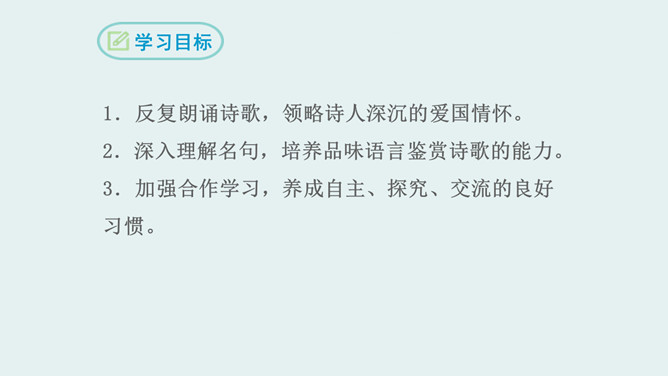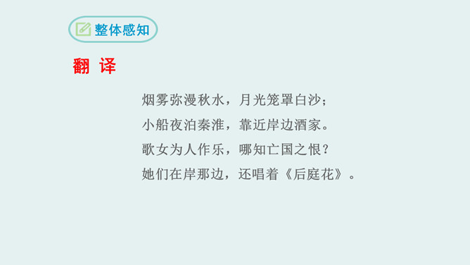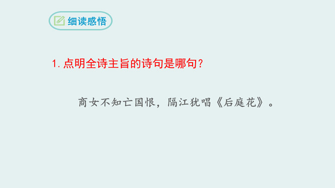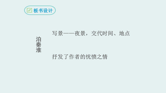 1.反复朗诵诗歌,领略诗人深沉的爱国情怀。 2.深入理解名句,培养品味语言鉴赏诗歌的能力。 3.加强合作学习,养成自主、探究、交流的良好习惯。这首诗于情景交融的意境中,形象而典型地表现了晚唐的时代气氛,使人从陈后主的荒淫亡国联想到江河日下的晚唐的命运,委婉含蓄的表达了诗人对国家命运的关切和忧虑,对世道的愤慨。全诗内容深厚,感情深沉,意味无穷,引人深思。所属专题:泊秦淮ppt。