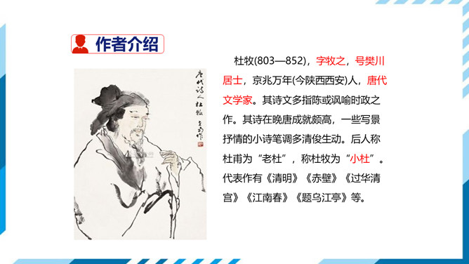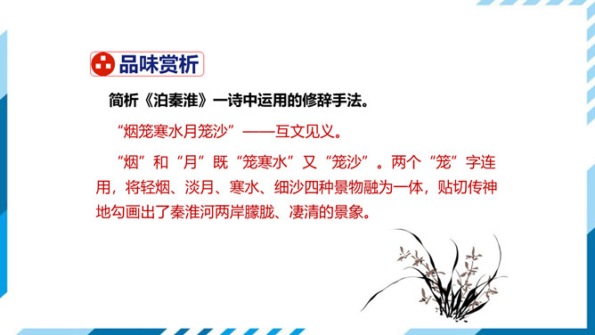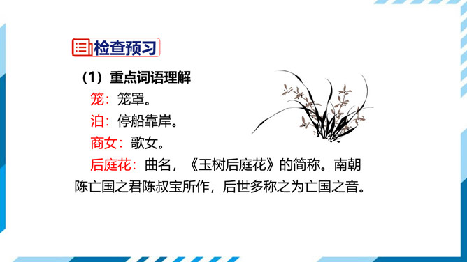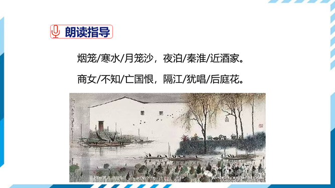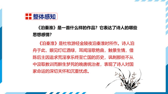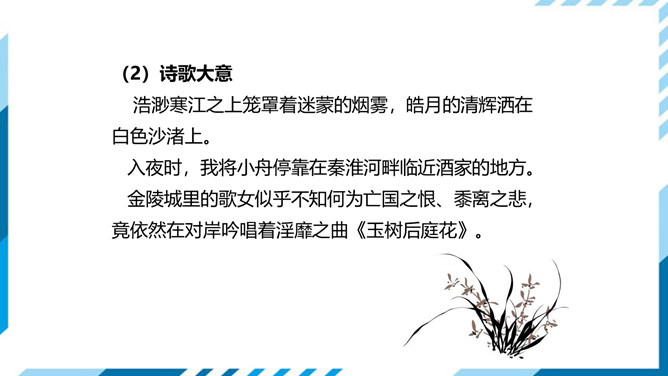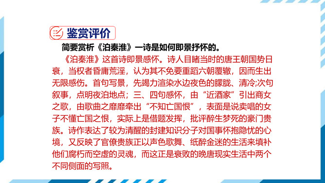 这首诗即景感怀。诗人目睹当时的唐王朝国势日衰,当权者昏庸荒淫,认为其不免要重蹈六朝覆辙,因而生出无限感伤。首句写景,先竭力渲染水边夜色的朦胧、清冷;次句叙事,点明夜泊地点;三、四句感怀,由“近酒家”引出商女之歌,由歌曲之靡靡牵出“不知亡国恨”,表面是说卖唱的女子不懂亡国之恨,实际上是借题发挥,批评醉生梦死的豪门贵族。诗作表达了较为清醒的封建知识分子对国事怀抱隐忧的心境,又反映了官僚贵族正以声色歌舞、纸醉金迷的生活来填补他们腐朽而空虚的灵魂,而这正是衰败的晚唐现实生活中两个不同侧面的写照。所属专题:泊秦淮ppt。