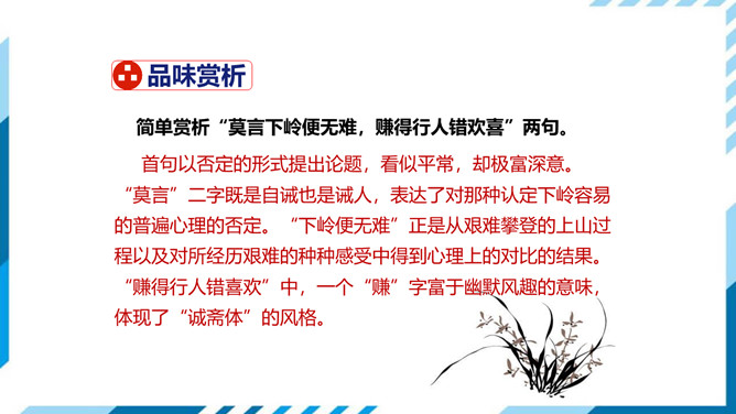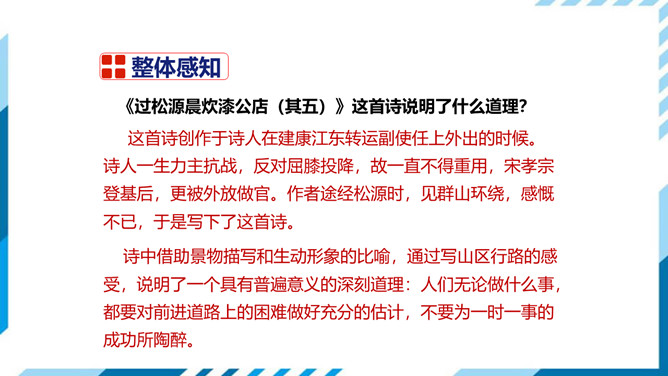 这首诗创作于诗人在建康江东转运副使任上外出的时候。诗人一生力主抗战,反对屈膝投降,故一直不得重用,宋孝宗登基后,更被外放做官。作者途经松源时,见群山环绕,感慨不已,于是写下了这首诗。诗中借助景物描写和生动形象的比喻,通过写山区行路的感受,说明了一个具有普遍意义的深刻道理:人们无论做什么事,都要对前进道路上的困难做好充分的估计,不要为一时一事的成功所陶醉。首句以否定的形式提出论题,看似平常,却极富深意。“莫言”二字既是自诫也是诫人,表达了对那种认定下岭容易的普遍心理的否定。所属专题:过松源晨炊漆公店ppt。