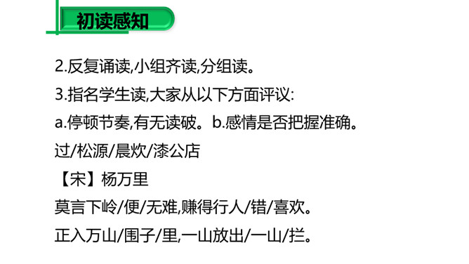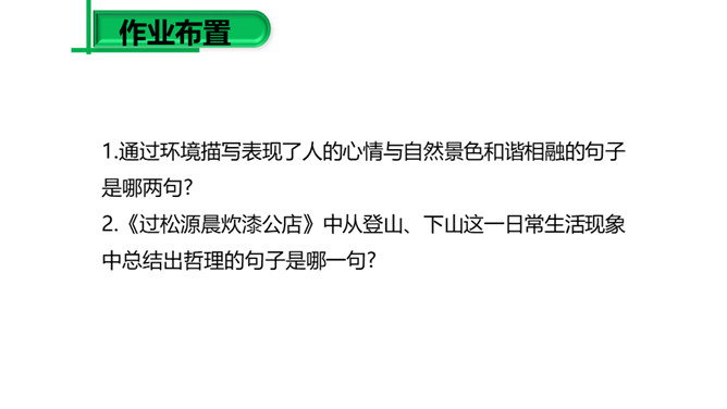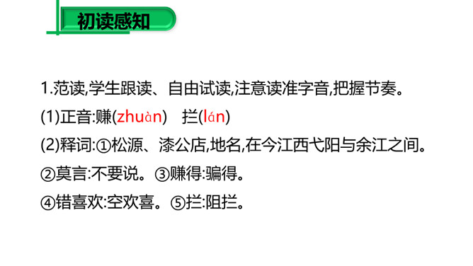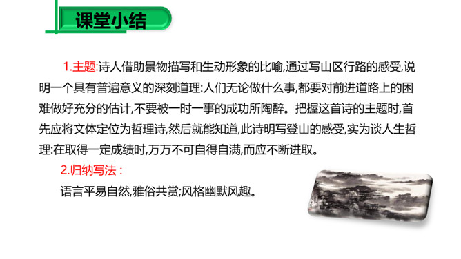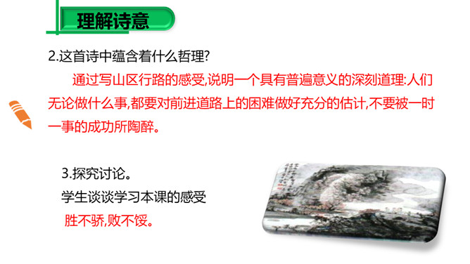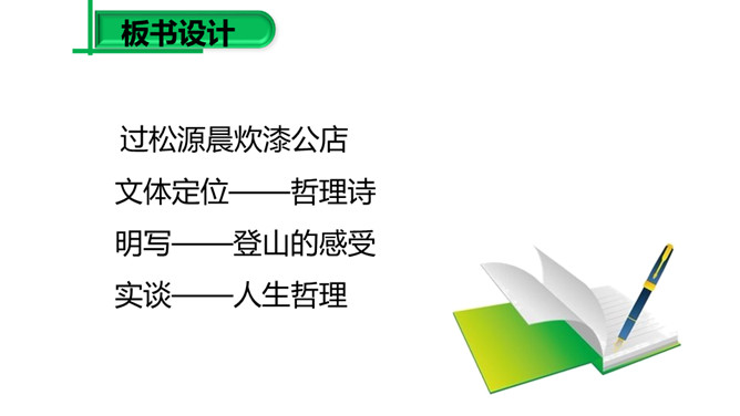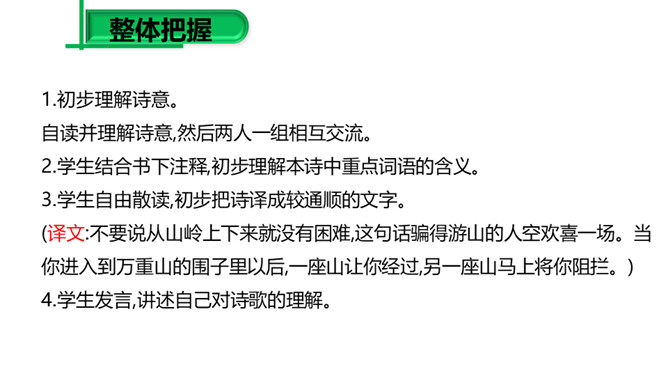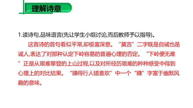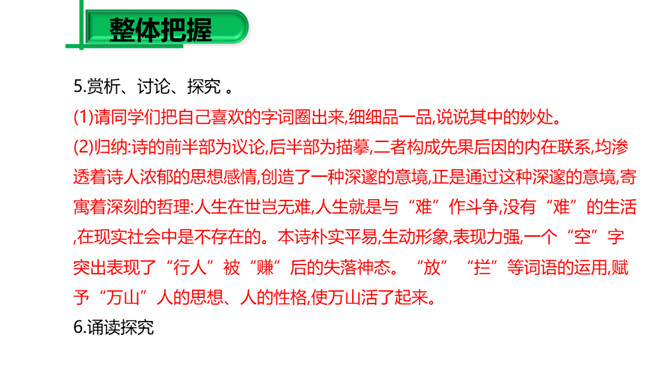 (1)请同学们把自己喜欢的字词圈出来,细细品一品,说说其中的妙处。 (2)归纳:诗的前半部为议论,后半部为描摹,二者构成先果后因的内在联系,均渗透着诗人浓郁的思想感情,创造了一种深邃的意境,正是通过这种深邃的意境,寄寓着深刻的哲理:人生在世岂无难,人生就是与“难”作斗争,没有“难”的生活,在现实社会中是不存在的。本诗朴实平易,生动形象,表现力强,一个“空”字突出表现了“行人”被“赚”后的失落神态。“放”“拦”等词语的运用,赋予“万山”人的思想、人的性格,使万山活了起来。所属专题:过松源晨炊漆公店ppt。