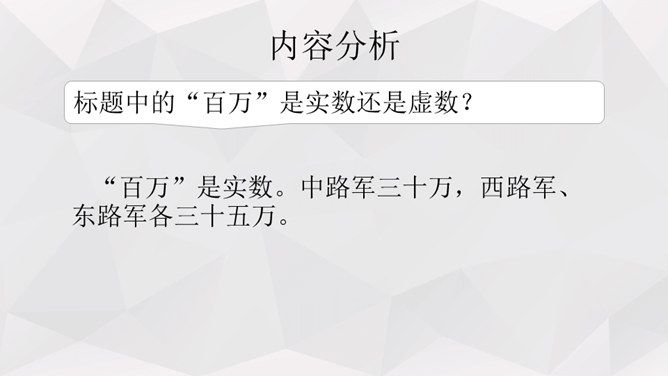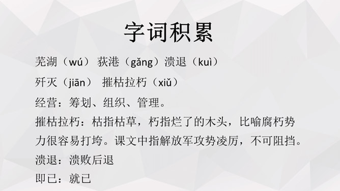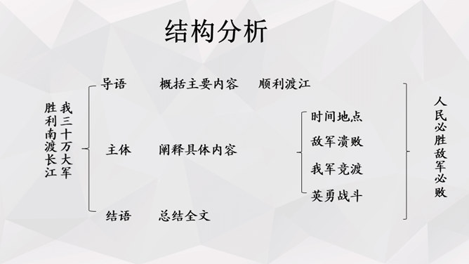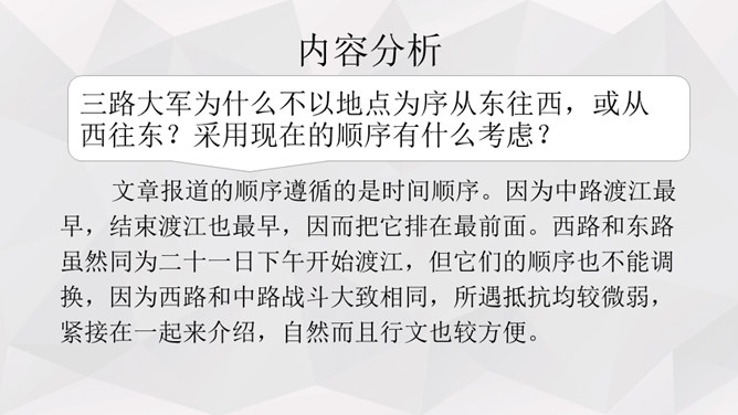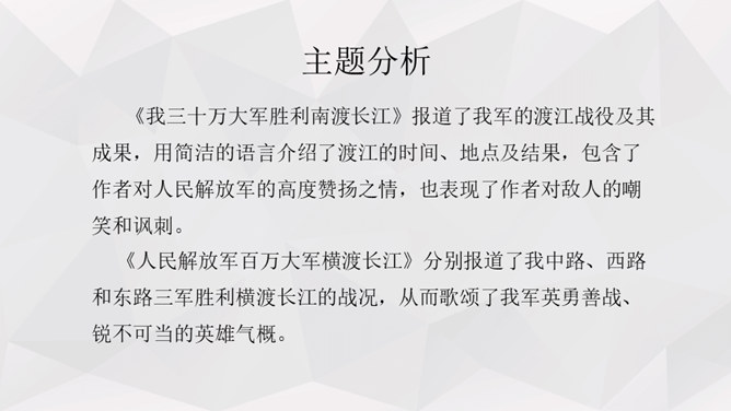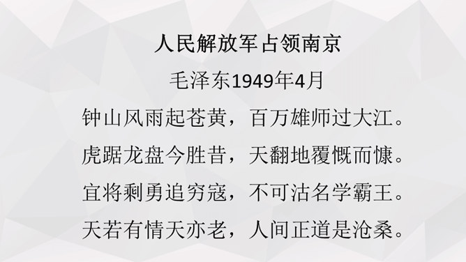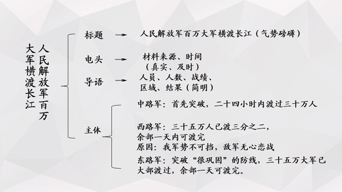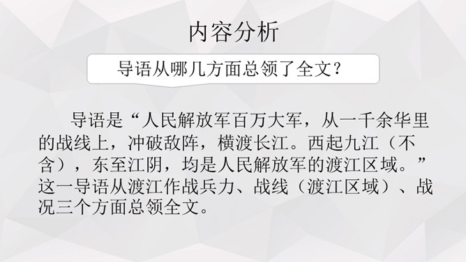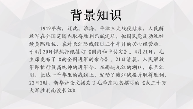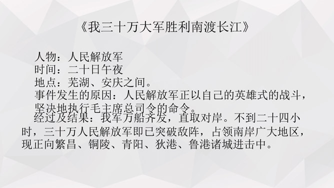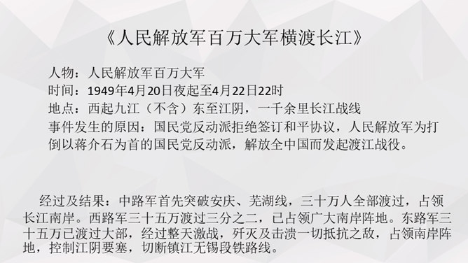 人物:人民解放军百万大军。时间:1949年4月20日夜起至4月22日22时。地点:西起九江(不含)东至江阴,一千余里长江战线。事件发生的原因:国民党反动派拒绝签订和平协议,人民解放军为打倒以蒋介石为首的国民党反动派,解放全中国而发起渡江战役。经过及结果:中路军首先突破安庆、芜湖线,三十万人全部渡过,占领长江南岸。西路军三十五万渡过三分之二,已占领广大南岸阵地。东路军三十五万已渡过大部,经过整天激战,歼灭及击溃一切抵抗之敌,占领南岸阵地,控制江阴要塞,切断镇江无锡段铁路线。所属专题:我三十万大军胜利南渡长江ppt、人民解放军百万大军横渡长江ppt。