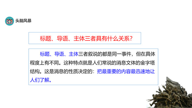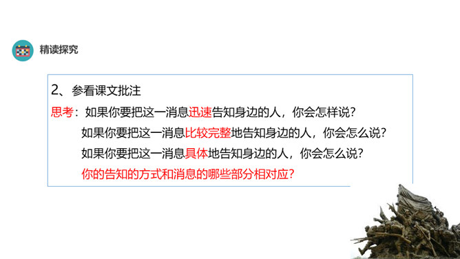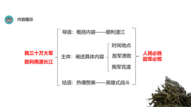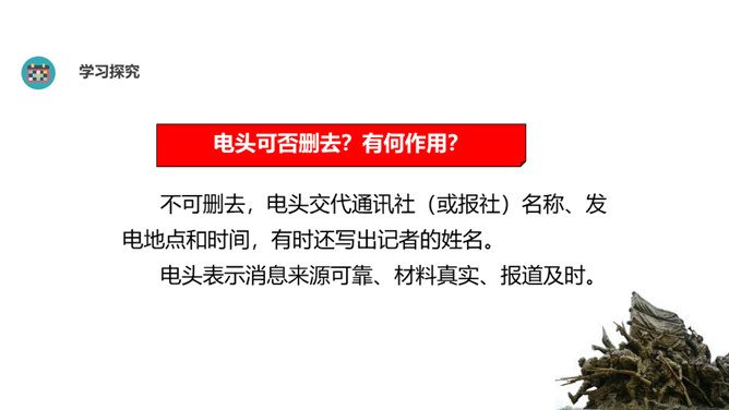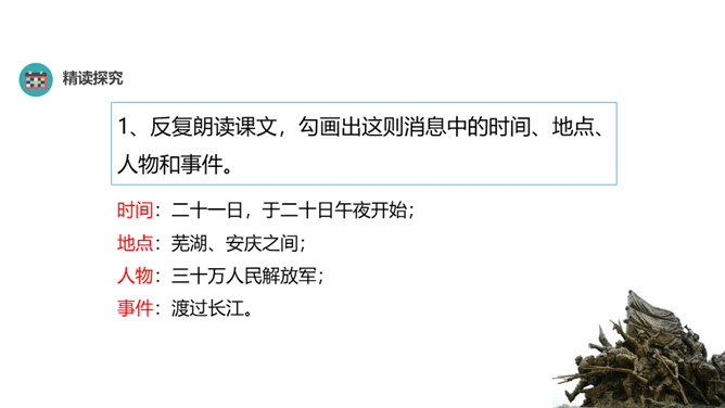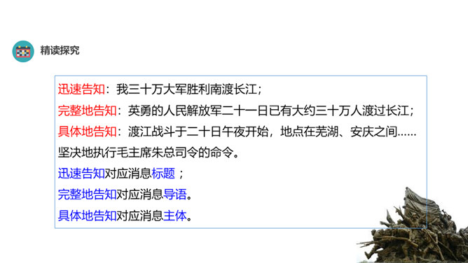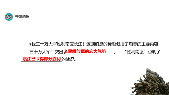 电头可否删去?有何作用?不可删去,电头交代通讯社(或报社)名称、发电地点和时间,有时还写出记者的姓名。电头表示消息来源可靠、材料真实、报道及时。反复朗读课文,勾画出这则消息中的时间、地点、人物和事件。 思考:如果你要把这一消息迅速告知身边的人,你会怎样说?如果你要把这一消息比较完整地告知身边的人,你会怎么说?如果你要把这一消息具体地告知身边的人,你会怎么说?你的告知的方式和消息的哪些部分相对应?迅速告知:我三十万大军胜利南渡长江;完整地告知:英勇的人民解放军二十一日已有大约三十万人渡过长江。所属专题:我三十万大军胜利南渡长江ppt、人民解放军百万大军横渡长江ppt。