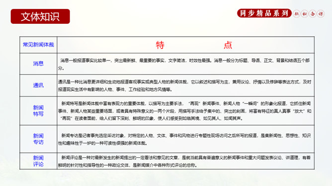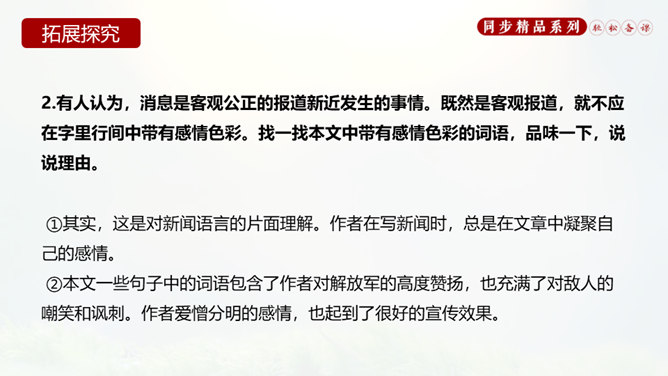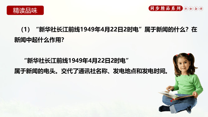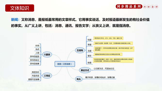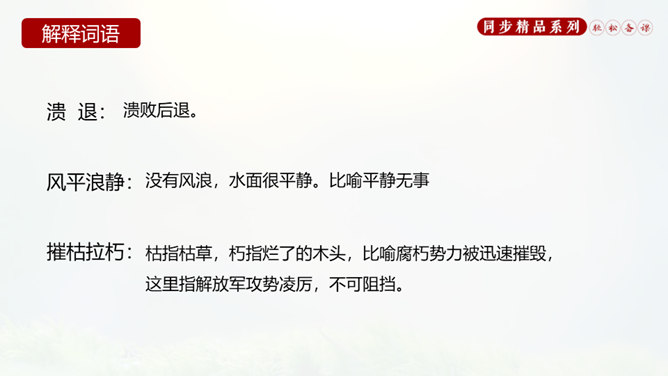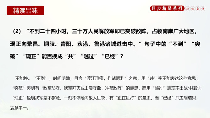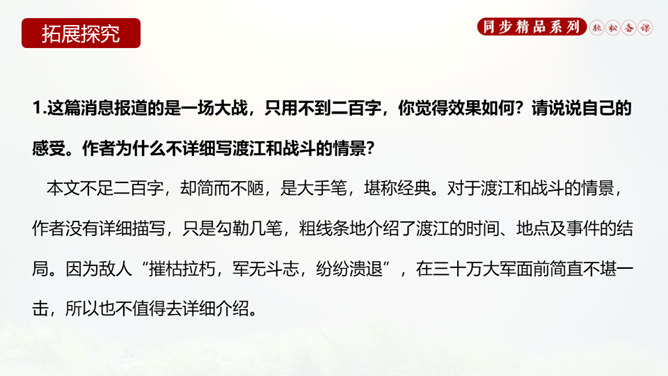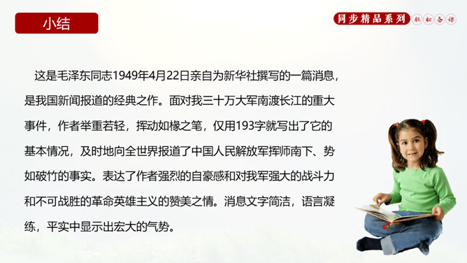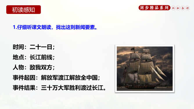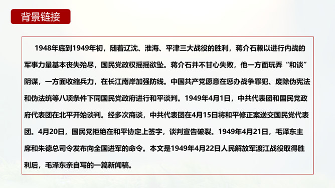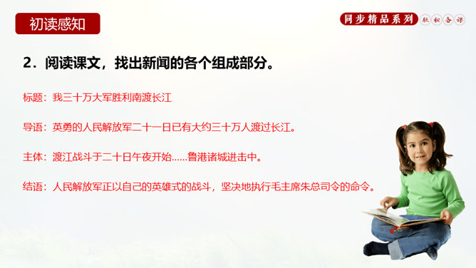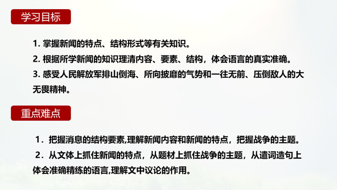 学习目标:1. 掌握新闻的特点、结构形式等有关知识。2. 根据所学新闻的知识理清内容、要素、结构,体会语言的真实准确。3. 感受人民解放军排山倒海、所向披靡的气势和一往无前、压倒敌人的大无畏精神。重点难点:1.把握消息的结构要素,理解新闻内容和新闻的特点,把握战争的主题。2.从文体上抓住新闻的特点,从题材上抓住战争的主题,从遣词造句上 体会准确精练的语言,理解文中议论的作用。所属专题:我三十万大军胜利南渡长江ppt。