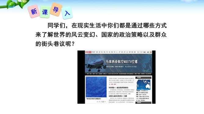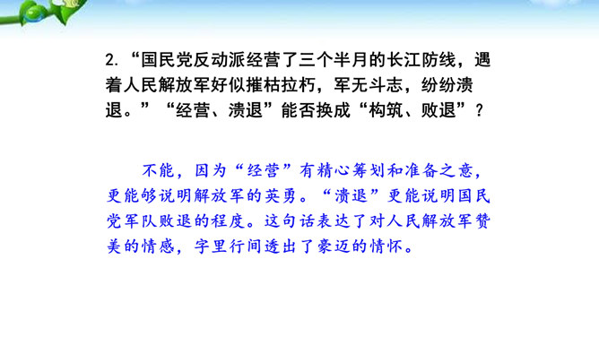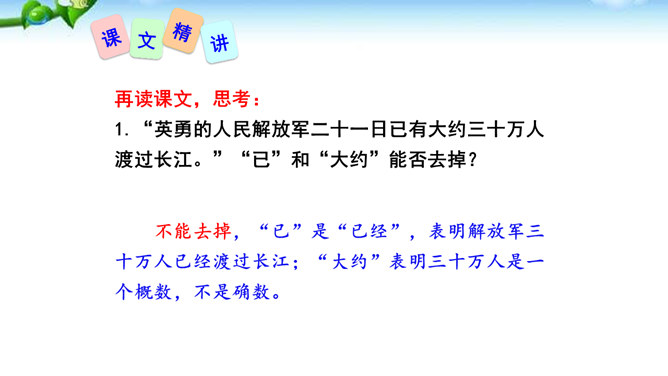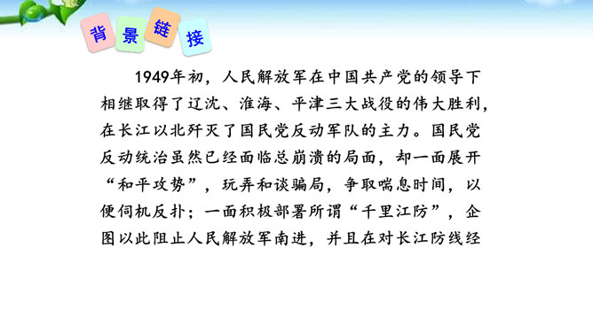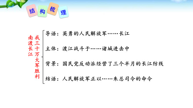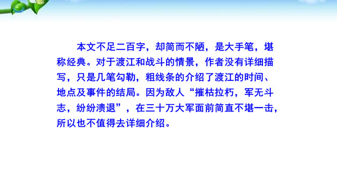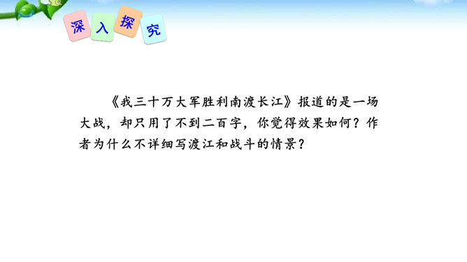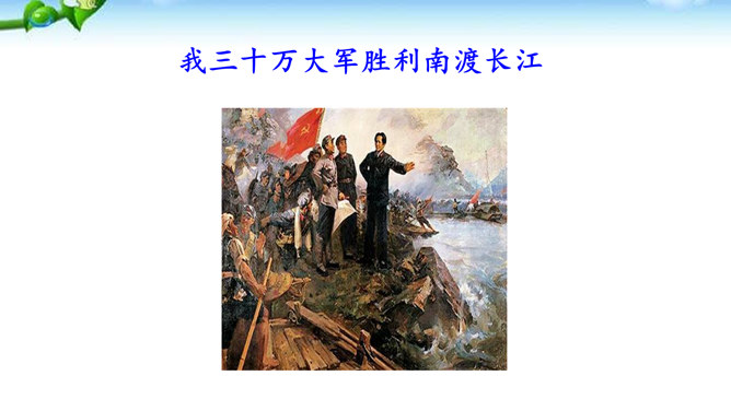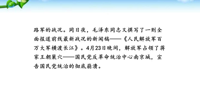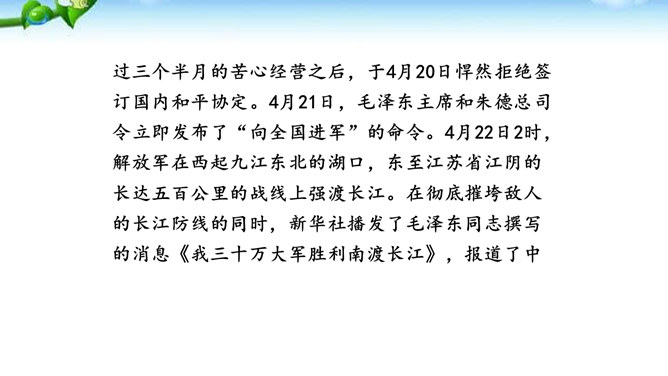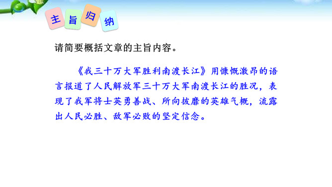 在现实生活中你们都是通过哪些方式来了解世界的风云变幻、国家的政治策略以及群众的街头巷议呢?本文不足二百字,却简而不陋,是大手笔,堪称经典。对于渡江和战斗的情景,作者没有详细描写,只是几笔勾勒,粗线条的介绍了渡江的时间、地点及事件的结局。因为敌人“摧枯拉朽,军无斗志,纷纷溃退”,在三十万大军面前简直不堪一击,所以也不值得去详细介绍。慷慨激昂的语言报道了人民解放军三十万大军南渡长江的胜况,表现了我军将士英勇善战、所向披靡的英雄气概,流露出人民必胜、敌军必败的坚定信念。所属专题:我三十万大军胜利南渡长江ppt、人民解放军百万大军横渡长江ppt。