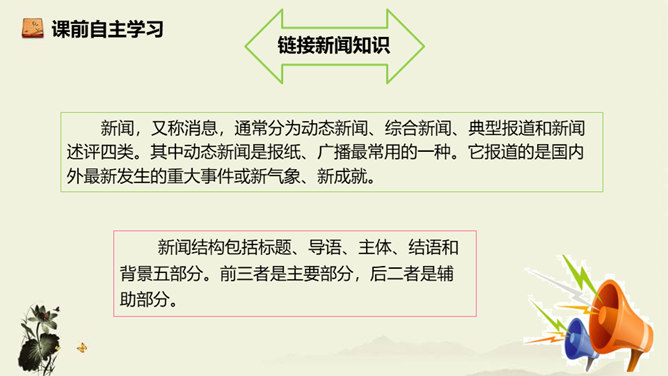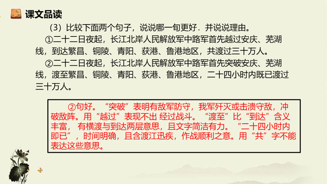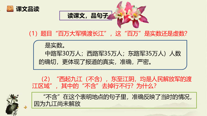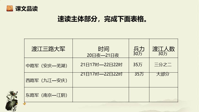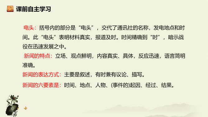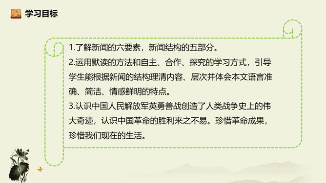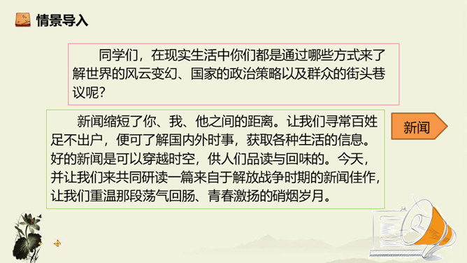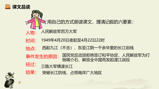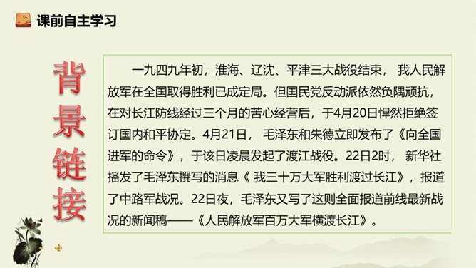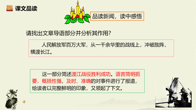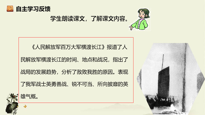 新闻缩短了你、我、他之间的距离。让我们寻常百姓足不出户,便可了解国内外时事,获取各种生活的信息。好的新闻是可以穿越时空,供人们品读与回味的。今天,并让我们来共同研读一篇来自于解放战争时期的新闻佳作,让我们重温那段荡气回肠、青春激扬的硝烟岁月。1.了解新闻的六要素,新闻结构的五部分。2.运用默读的方法和自主、合作、探究的学习方式,引导学生能根据新闻的结构理清内容、层次并体会本文语言准确、简洁、情感鲜明的特点。3.认识中国人民解放军英勇善战创造了人类战争史上的伟大奇迹,认识中国革命的胜利来之不易。所属专题:人民解放军百万大军横渡长江ppt。